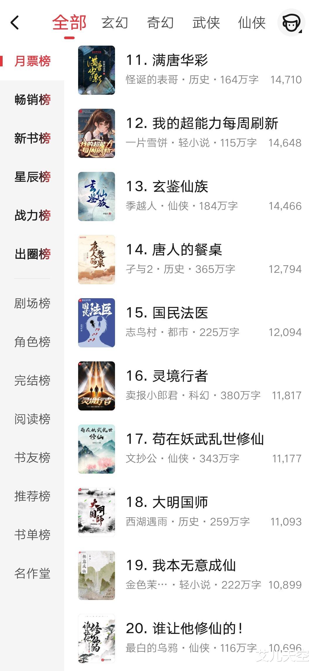 姬叉的《乱世书》过了两百万字了,剧情上的新鲜感确实有所下滑,大眼珠子的《深海余烬》第十,暂时充当守门员的位置。这个月可能又拿不到第三,只能第四了。