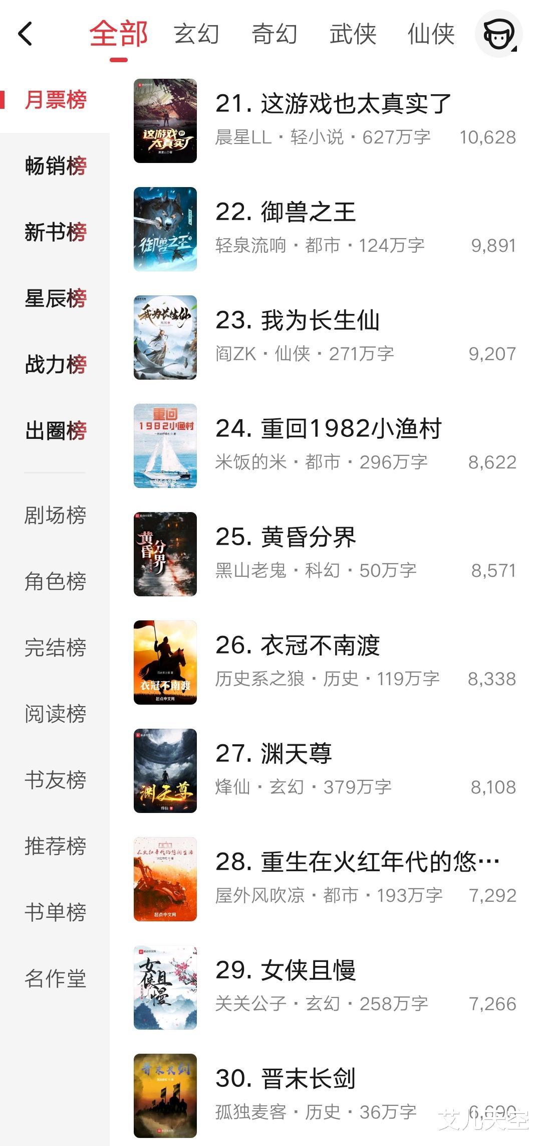孤独麦客《晋末长剑》排名第30,这个月的新书月票榜第一,冷门朝代写得好的话也确实容易杀出来。