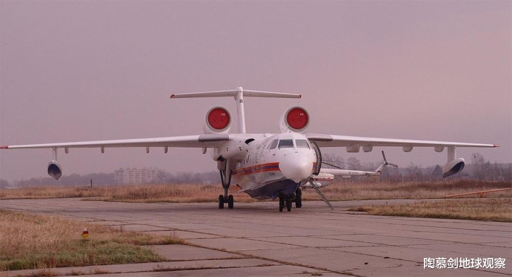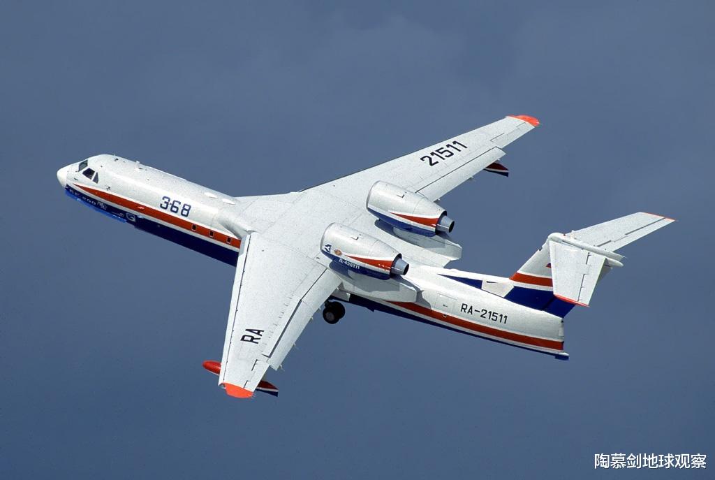 Be-200两栖飞机,1998年在陆上首飞,1999年实现水面起降,2003年开始投入生产,目前仅生产约25架。该机全长32米,空重27.6吨,最大陆地起飞重量41吨(水中为37.9吨),配有两台D-436TP涡扇发动机,单台推力73.55千牛。Be-200的最高速度为700公里/小时,续航速度560公里/小时,最大航程3300公里,机组成员5人,载客能力为44人,最大货物载荷为7.5吨(消防用水载荷12吨)。