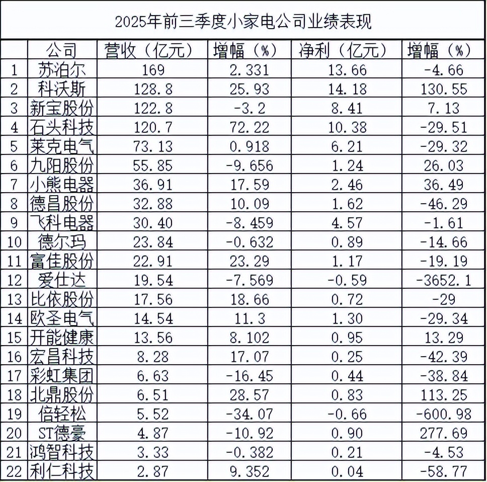 而据A股22家小家电上市公司披露的前三季度业绩:15家公司业绩出现不同程度的下滑,有两家公司盈转亏;另7家公司业绩同比增长,有3家公司净利润翻番。