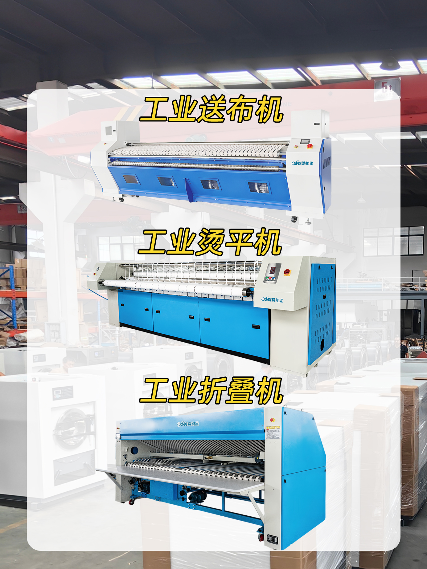 一站式洗涤设备供应从全自动洗脱机、节能高效烘干机、送布机、工业烫平机到工业折叠机,洗能星提供全套高效、节能、稳定的。您无需四处奔波,我们一站式配齐,保障设备间的完美协同与整体解决方案的卓越性能。