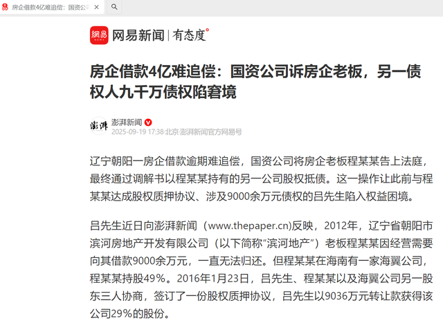 辽宁朝阳一房企借款逾期难追偿,国资公司将房企老板程某某告上法庭,最终通过调解书以程某某持有的另一公司股权抵债。这一操作让此前与程某某达成股权质押协议、涉及9000余万元债权的吕先生陷入权益困境。