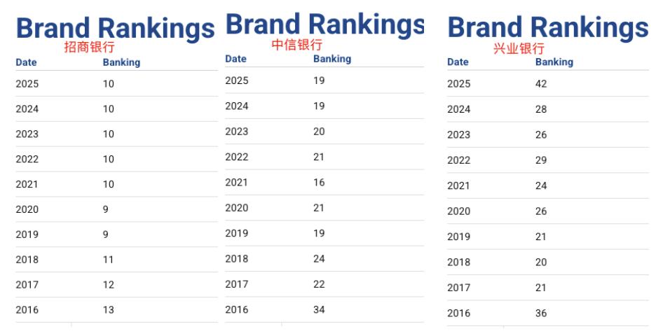 横向对比同业,这种差距更为明显。招商银行在同期稳居全球前10,2020-2025年排名始终保持在第9-10位,展现出强大且稳定的品牌影响力;中信银行则后程发力,从2020年的第21位攀升至2025年的第19位,呈现出积极向上的发展态势;而浦发银行与兴业银行(从第24位跌至第42位)共同构成了股份行“双降”的样本,这一现象值得深入反思。