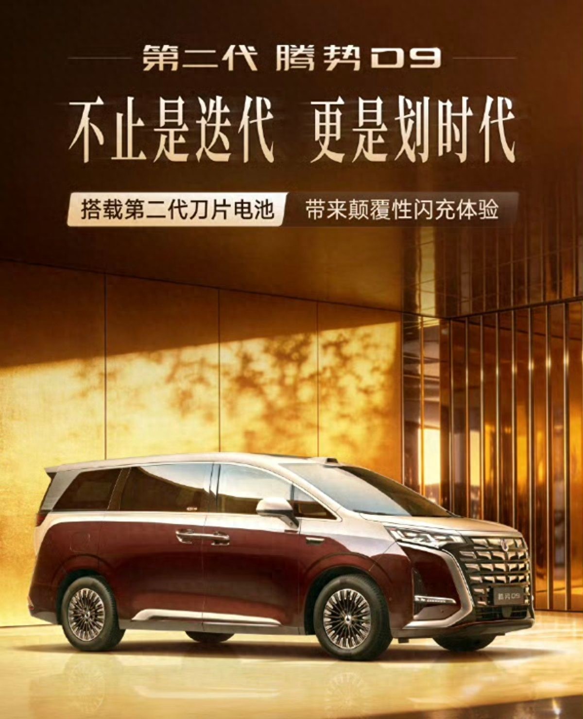 连续三年销冠的腾势D9迎来换代。新车搭载第二代刀片电池,充电快得惊人:5分钟充好,9分钟充饱,零下30℃也只多3分钟。插混版纯电续航突破400公里,纯电版高达800公里。外观延续“优雅之势”,全新格栅更显豪迈。凭借更极致的技术与体验,第二代腾势D9作为新能源豪华MPV价值标杆,将再次重塑行业标准。新车预计上半年上市,闪充时代即将到来。