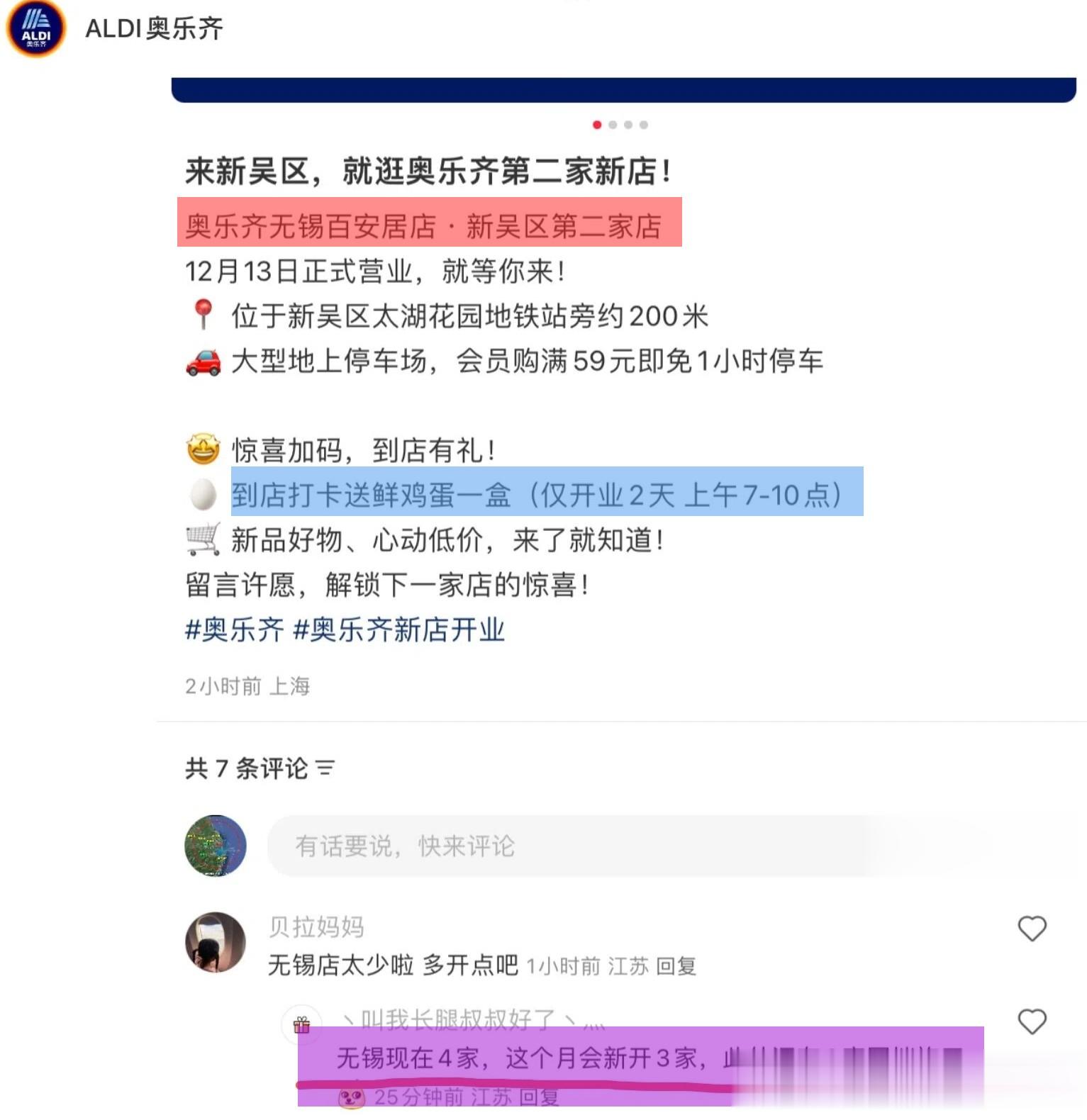 而整个无锡市,从网友的回复不难看出,整个无锡,现在已经开业奥乐齐4家!12月还会有3家陆续开业,另外正在施工中的奥乐齐超市,还有3家!