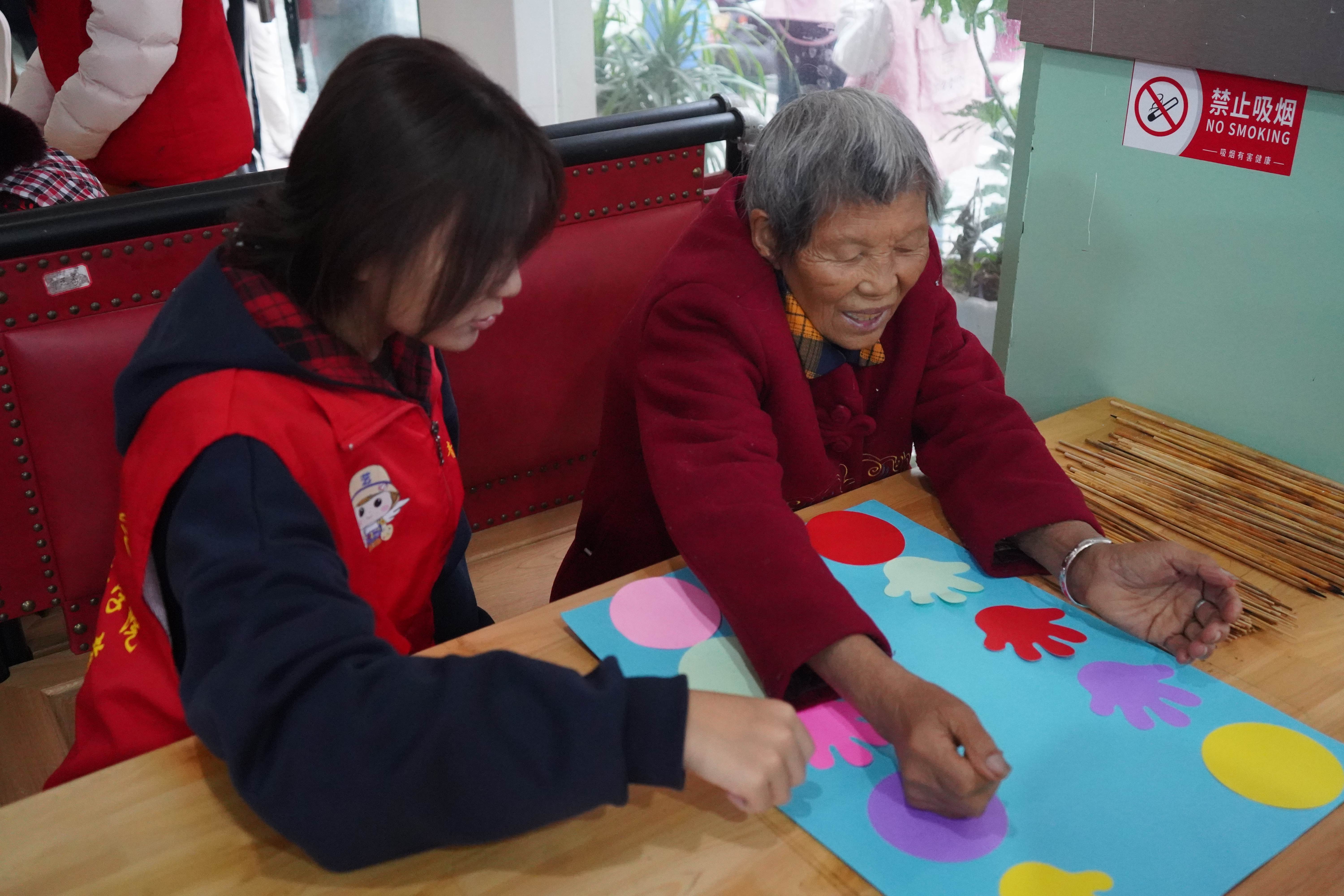 活动现场暖意融融、笑语盈盈,精心设计的环节,让老人们全程投入,乐在其中。游戏区里,“母鸡下蛋”“左手方,右手圆”“瓶盖接力王”“扑克大小王” 四款趣味游戏依次登场。志愿者们放慢语速、手把手示范规则,耐心搀扶行动不便的老人完成操作,每一个动作都饱含关切。休息间隙,志愿者们围坐于老人身旁,静静聆听他们讲述过往的工作经历、家庭趣事与岁月故事。在真诚的对话中,老人们的孤单渐渐消散,敬老院内满是温情流淌。文艺表演环节更添暖意,熟悉的旋律响起,老人们或轻声哼唱,或轻打节拍,眼中泛起回忆的微光。志愿者与老人的歌声交织回荡,将现场氛围推向高潮。