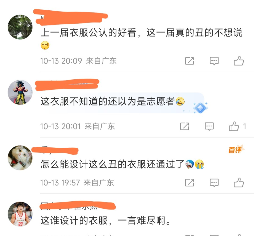 先来看广东男篮五虎,这应该还是老五虎了,胡明轩、赵睿、周鹏、任骏飞和杜润旺,他们五人身穿全运会队服进行合影。但网友吐槽这衣服实在是太难看了,有网友说“上一届衣服公认的好看,这一届丑的不想说,”也有网友说“这衣服不知道的还以为是志愿者”。更有网友表示“怎么能设计出这么丑的衣服,还通过了”,广东全运队服看着还可以,红白配色也是主流颜色,可能上一届太好看了,把这一届给比下去了,不知道大家觉得好不好看。