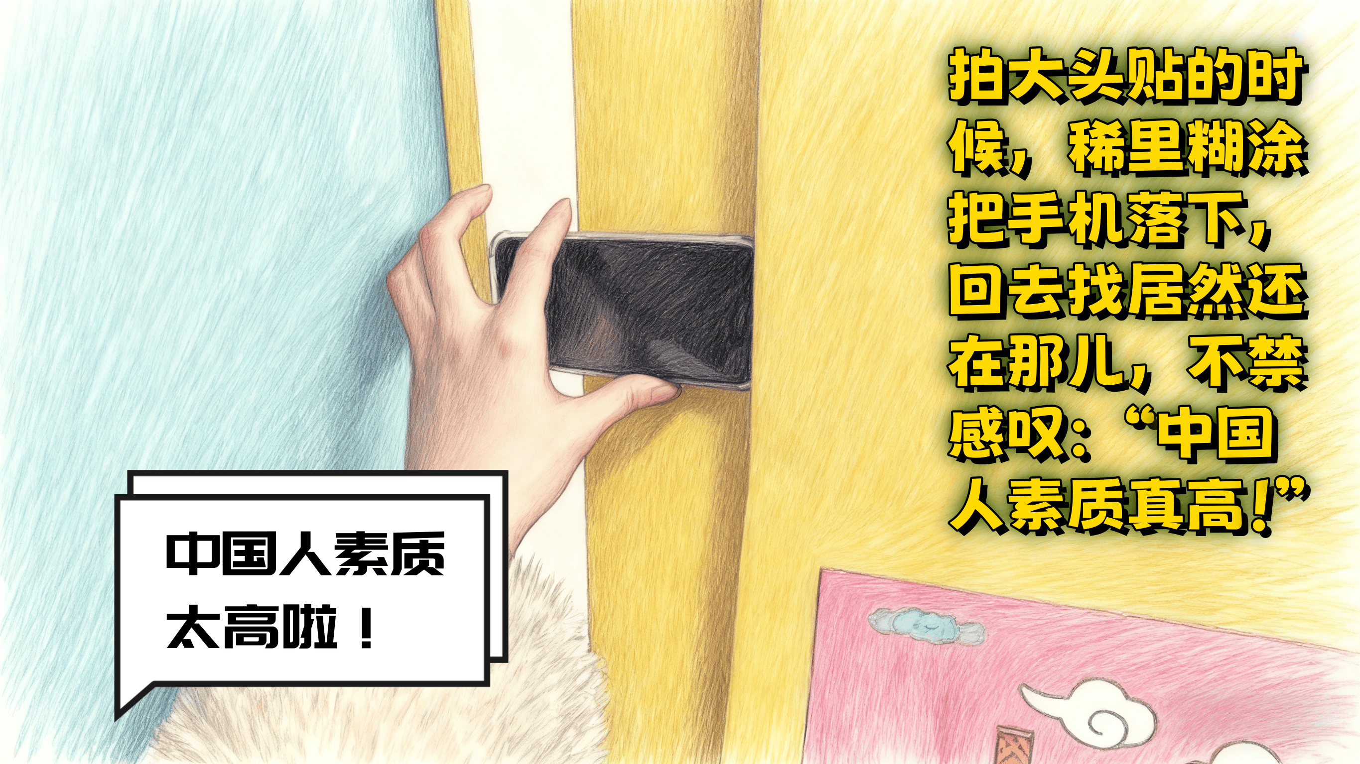 拍大头贴的时候,稀里糊涂把手机落下,回去找居然还在那儿,不禁感叹:“中国人素质真高!”