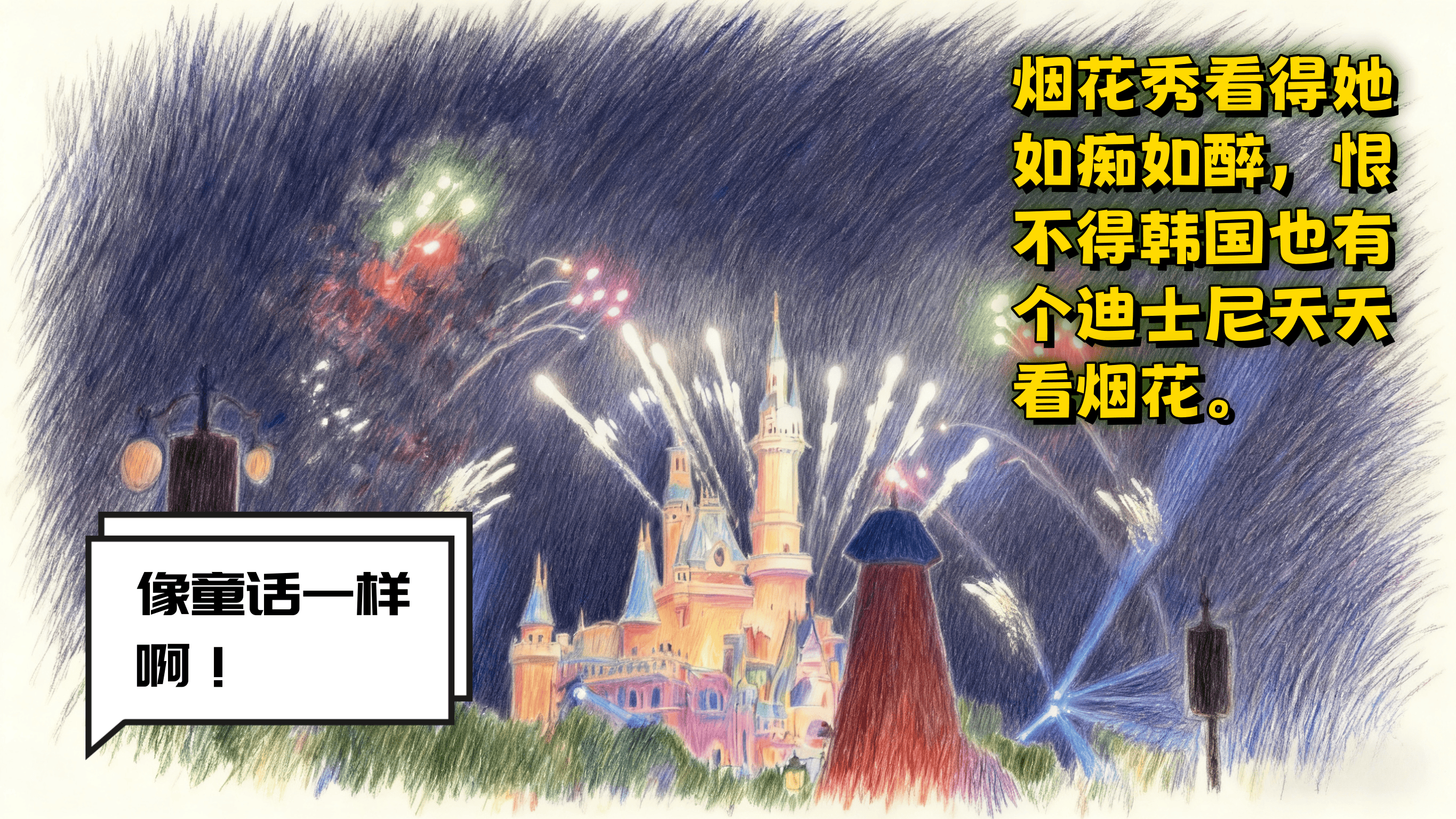 烟花秀看得她如痴如醉,恨不得韩国也有个迪士尼天天看烟花。