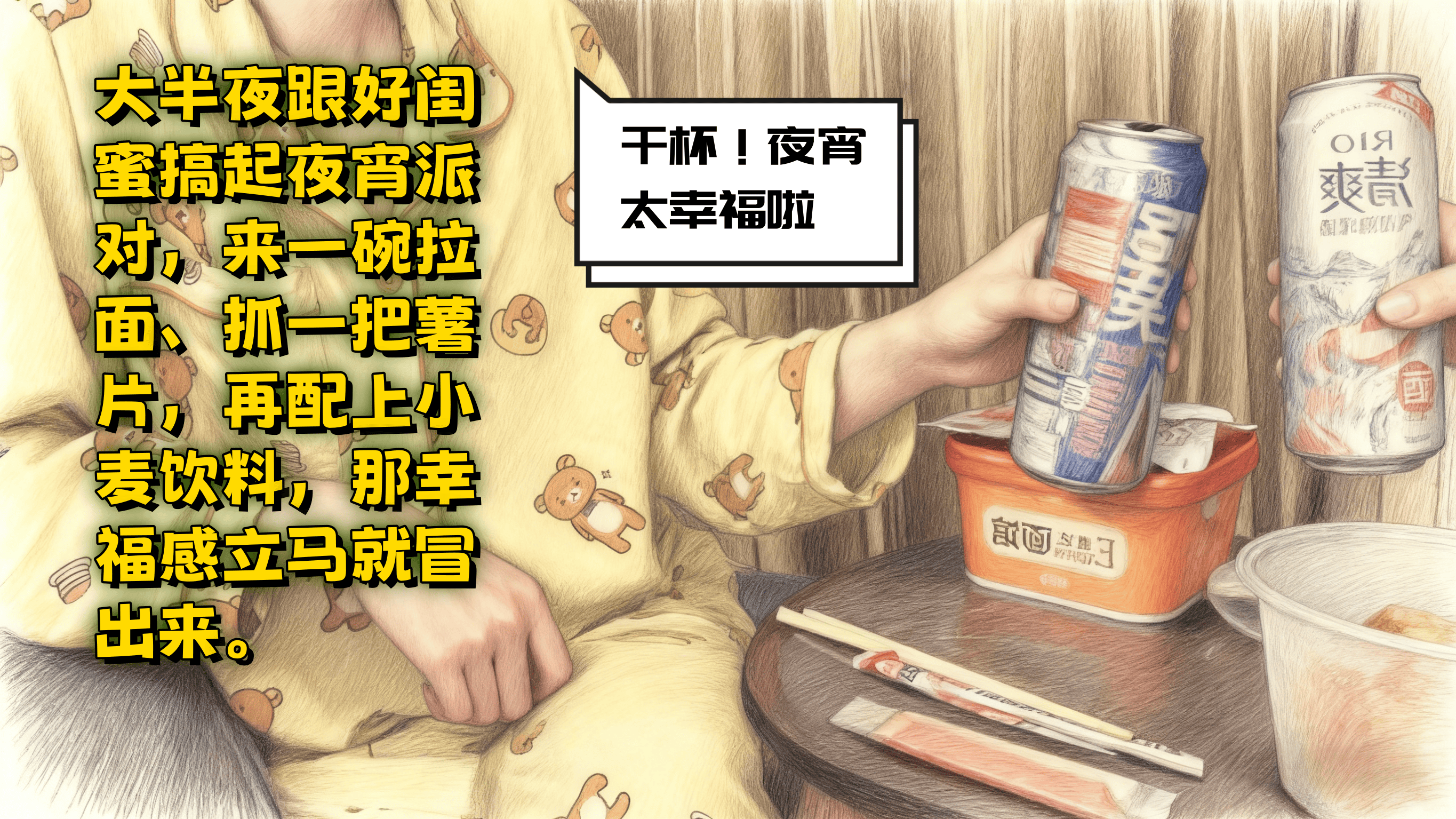 大半夜跟好闺蜜搞起夜宵派对,来一碗拉面、抓一把薯片,再配上小麦饮料,那幸福感立马就冒出来。
