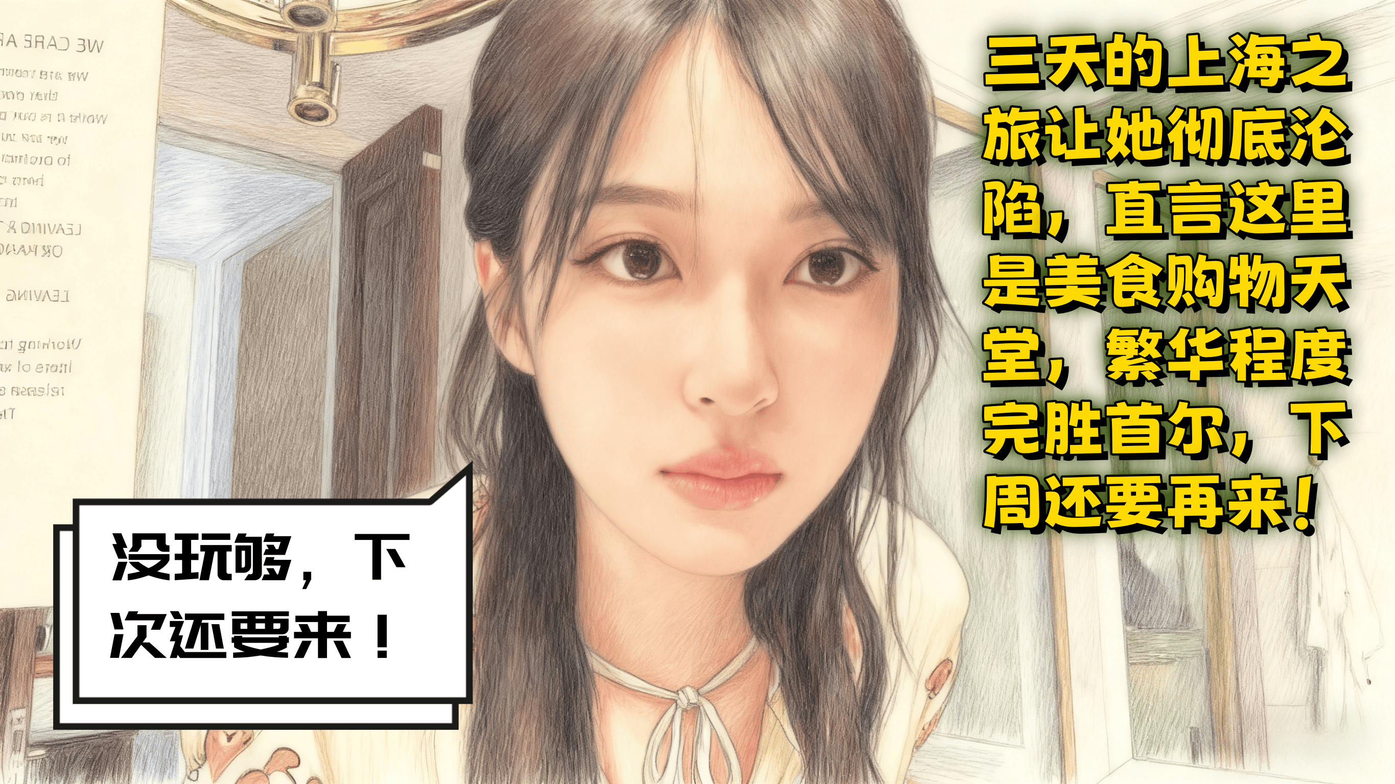 三天的上海之旅让她彻底沦陷,直言这里是美食购物天堂,繁华程度完胜首尔,下周还要再来!