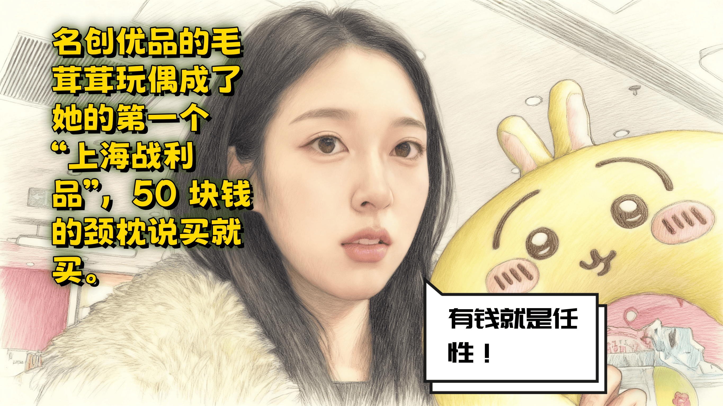 名创优品的毛茸茸玩偶成了她的第一个 “上海战利品”,50 块钱的颈枕说买就买。