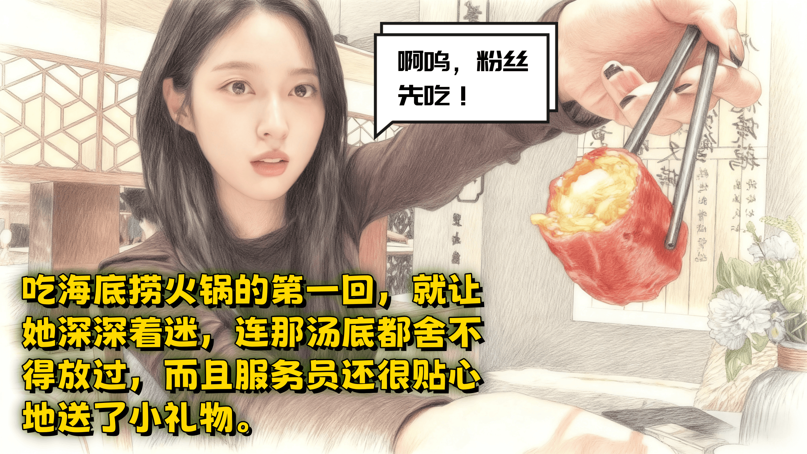 吃海底捞火锅的第一回,就让她深深着迷,连那汤底都舍不得放过,而且服务员还很贴心地送了小礼物。