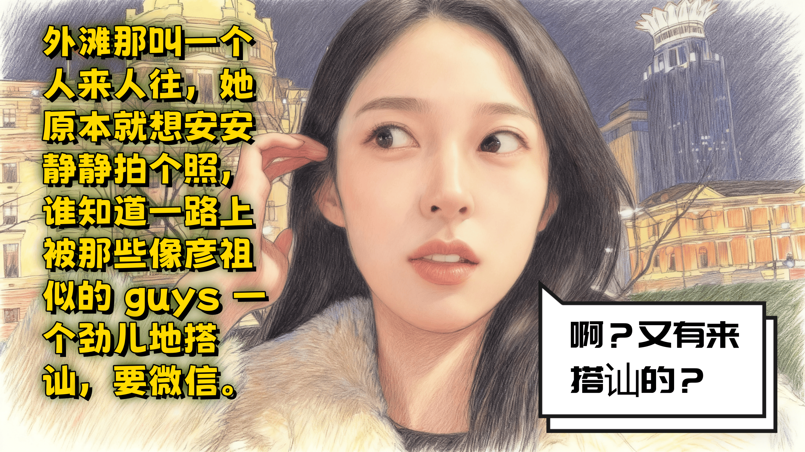 外滩那叫一个人来人往,她原本就想安安静静拍个照,谁知道一路上被那些像彦祖似的 guys 一个劲儿地搭讪,要微信。