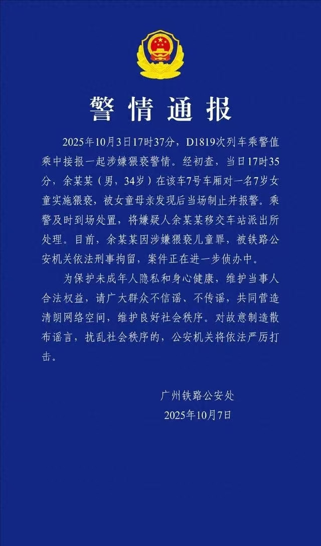 2025年10月3日,在一趟行驶的D1819次列车车厢内,一名7岁女童遭遇惊魂一刻。据广州铁路警方后续通报,34岁男子余某某因涉嫌猥亵该女童,已被依法刑事拘留。事件发生时,女童母亲敏锐察觉异常并立即制止,当场指斥余某某的猥亵行为。面对质问,余某某竟以“孩子可爱”等荒唐理由辩解。列车乘警接警后迅速到场,将嫌疑人控制并移交至派出所做进一步调查。