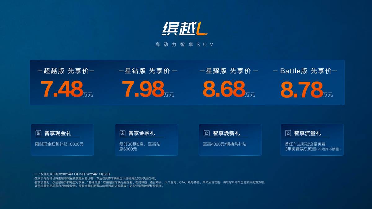 即日起至11月30日,购车还可享限时现金红包、36期0息、至高4000元换购补贴及免费流量等多重权益。吉利缤越L Battle版,不只一台车,更是一种态度。