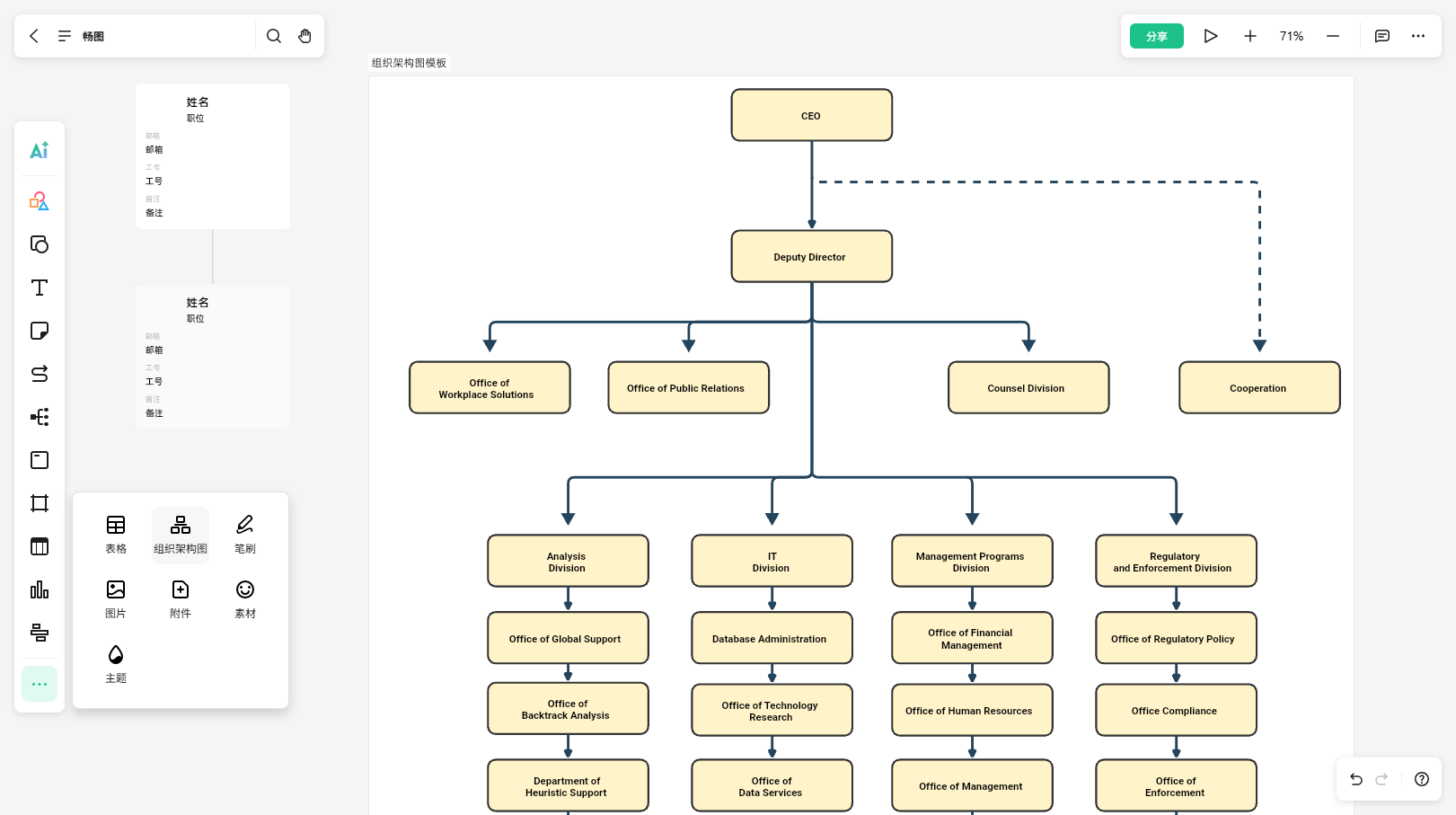进入编辑页面后,在主工具栏选择组织架构图,并将其拖入到画布中,即可创建组织架构图。