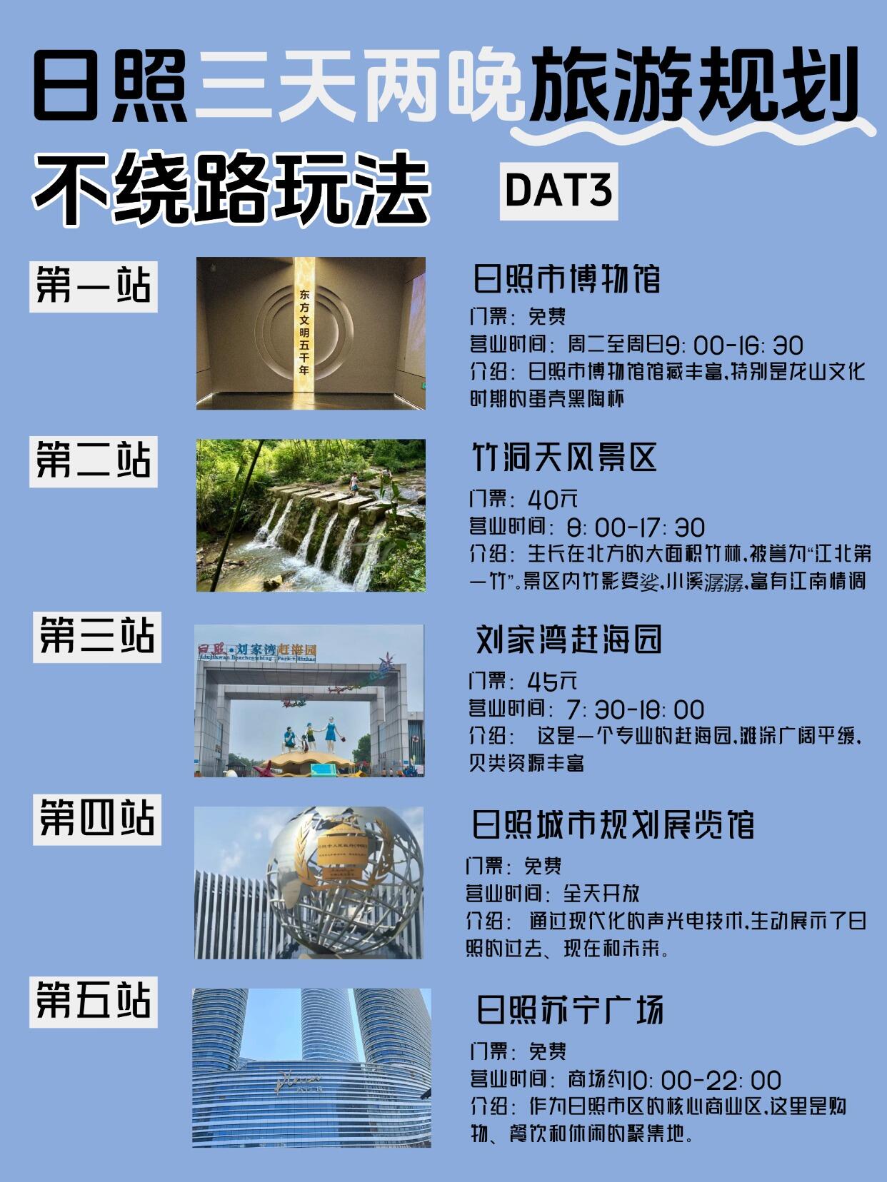 第三天:日照市博物馆-竹洞天风景区-刘家湾赶海园-日照城市规划展览馆-日照苏宁广场