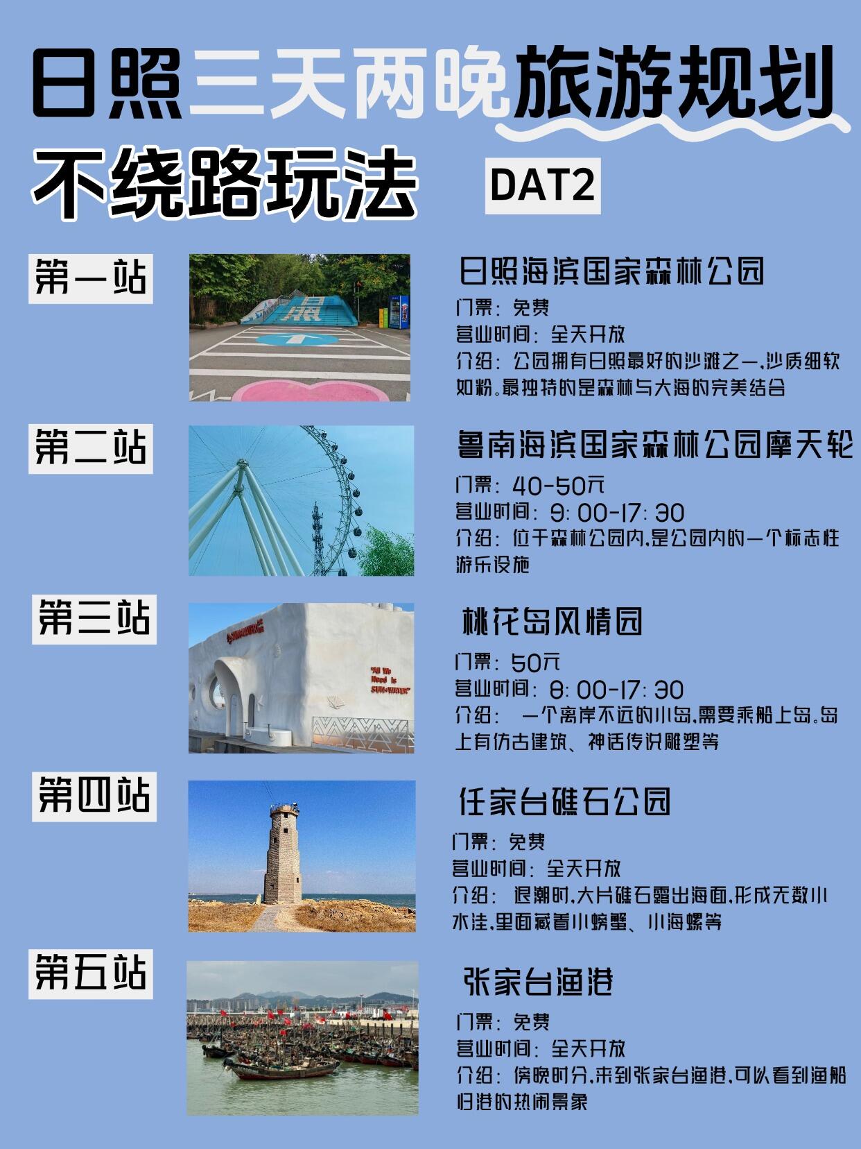 第二天:日照海滨国家森林公园-鲁南海滨国家森林公园摩天轮-桃花岛风情园-任家台礁石公园-张家台渔港