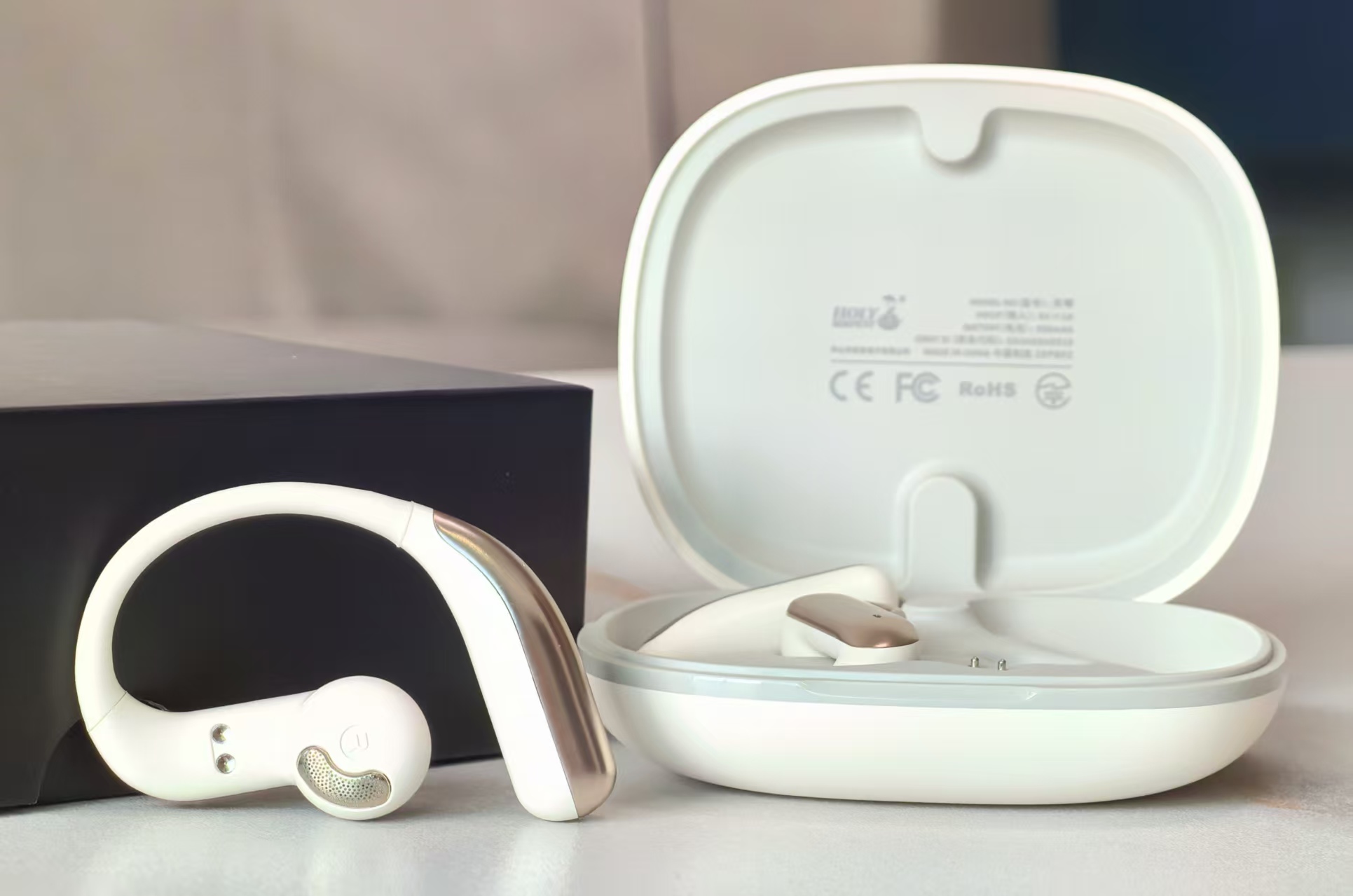 先看外观,配色方面有黑色和白色,我入手的这款是白色,目视感觉上有点偏卡其的意思,同时搭配上玫瑰金磨砂电镀工艺点缀,着实很有特点,外侧的小喇叭造型设计也非常别致,整体的流线型虽然是开放式耳机的传统设计,但是细节方面确实是有自己的特色,整体看起来非常有档次感。