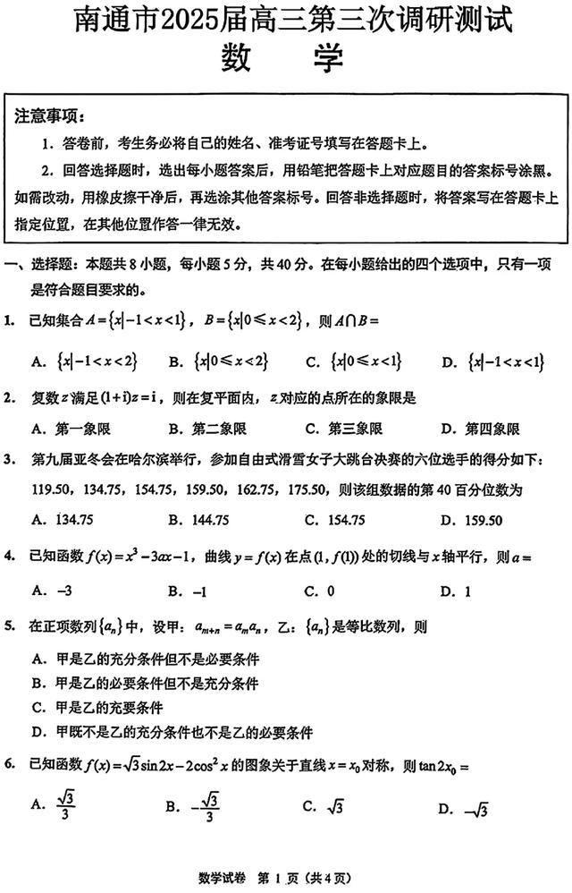 难度梯度合理选择题由易到难,逐步提升。例如第1题(集合交集)和第3题(百分位数)为基础题,第7题(极值点对称性)和第8题(椭圆几何)为综合应用题,区分度明显。