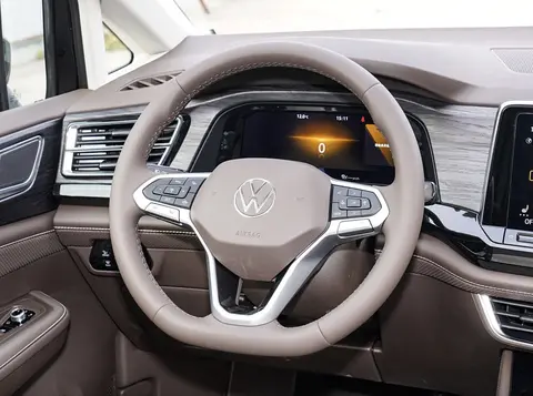 内饰方面,以“行政级舒适”为核心,中控台采用软质搪塑与木纹饰板拼接,30 色氛围灯可随音乐律动变化。10.25 英寸全液晶仪表与 9.2 英寸中控屏组成双联屏,支持 CarPlay/CarLife/HUAWEI HiCar 三屏互联,操作流畅度较老款提升30%。新增的电子挡把节省出中控下方储物空间,内置无线充电板支持15W快充。新增的 380TSI 越享版作为中配主力,标配双侧电滑门、真皮座椅与倒车影像,性价比更为突出。