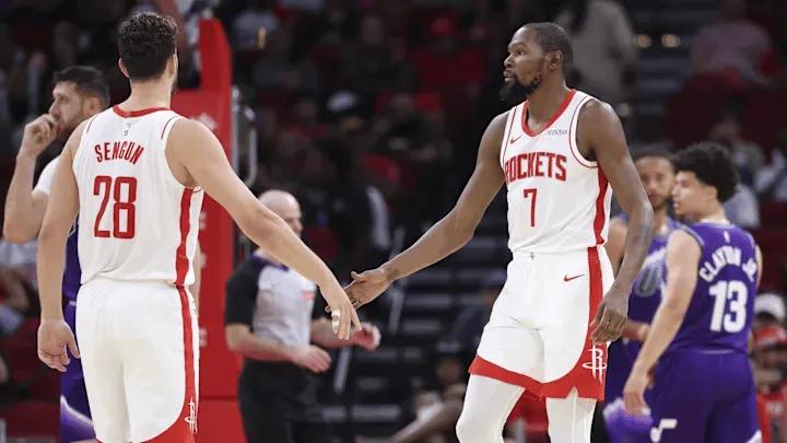 而且火箭彻底解决了死亡五大的顽疾,把奥科吉放进首发三场全胜,史密斯小前,内线杜兰特和申京,后场阿门和奥科吉铁索连舟防守拉满。乌度卡的策略就是把五大当配菜,常规阵容还得奥科吉首发才适合。因为伸缩性更好,外线能防出去。在最近3场乌度卡使用五大的时间是第二节下半段以及第三节和末节寻找时机使用,不是固定用。