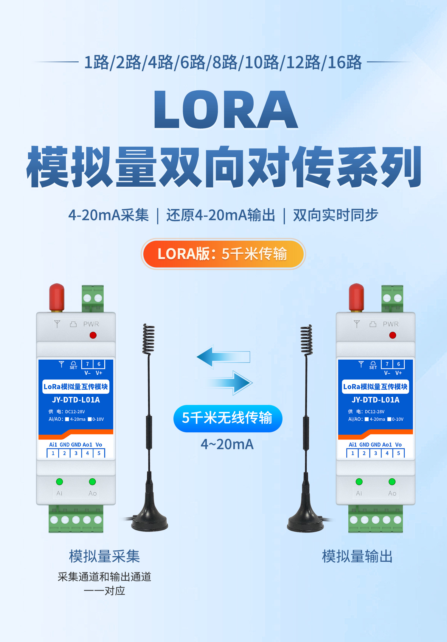 LoRa 模拟量互传模块是一款基于LoRa 扩频无线通信技术的物联网终端设备,核心功能是实现工业、农业、能源等场景中模拟量信号(如 4-20mA 电流、0-10V 电压、PT100 热电阻信号等)的无线采集、传输与互传,打破了传统模拟量信号依赖有线电缆传输的限制,是连接各类模拟量传感器、控制器与物联网系统的关键无线桥梁。