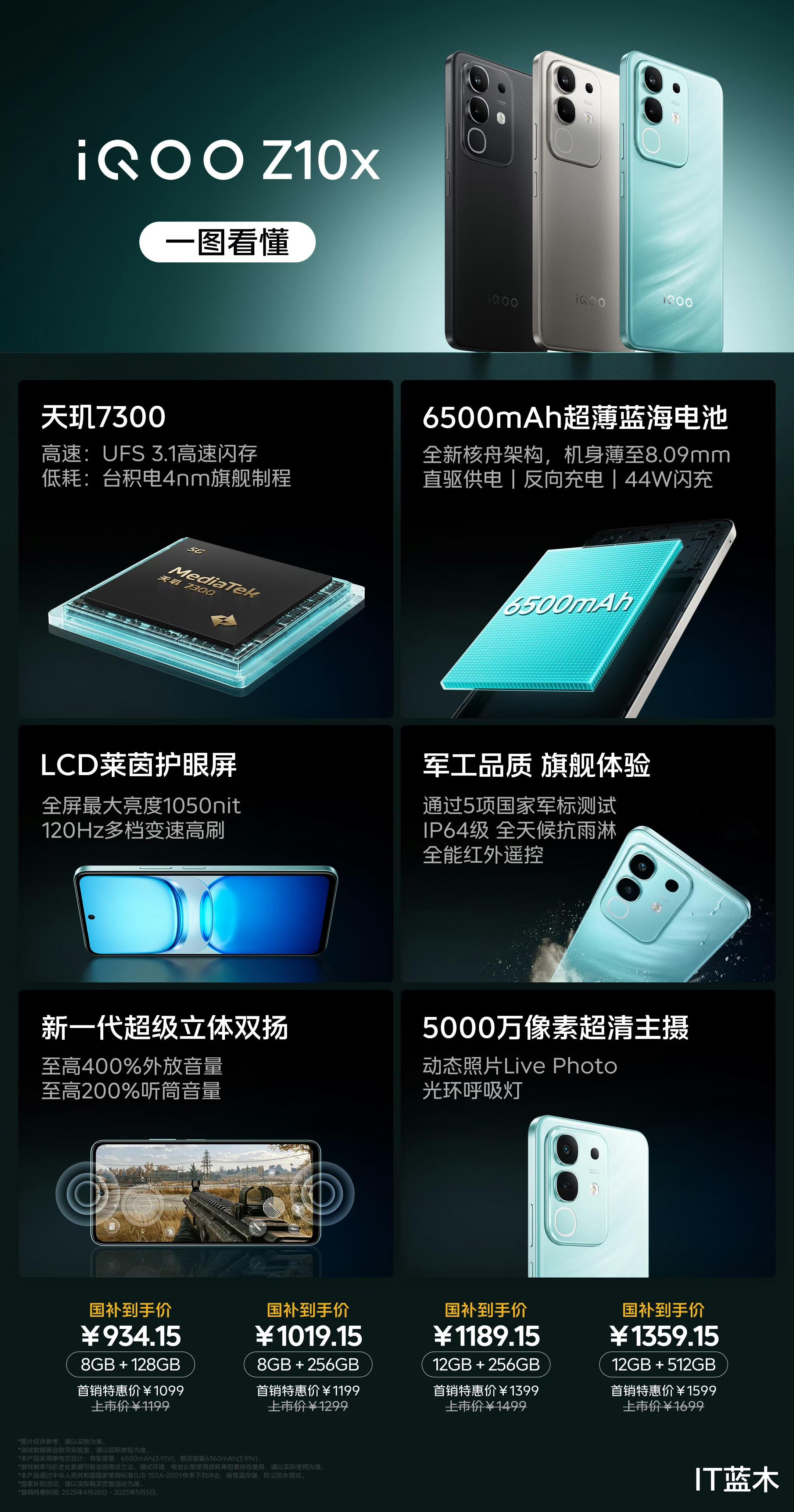 iQOO Z10x,内存8+128GB起步,价格1099元到1599元,国补后934元起,iQOO Z10x参数如下: