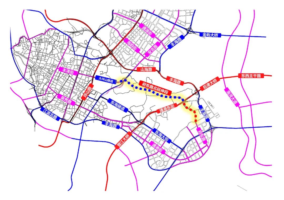 东海至城东第二通道——府东路北延伸段,全长5.5千米,总投资预估约18亿元,分为南北两段建设。