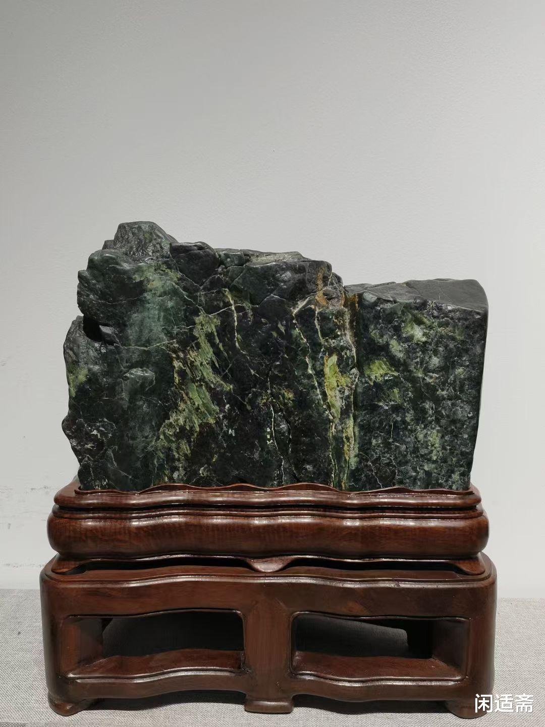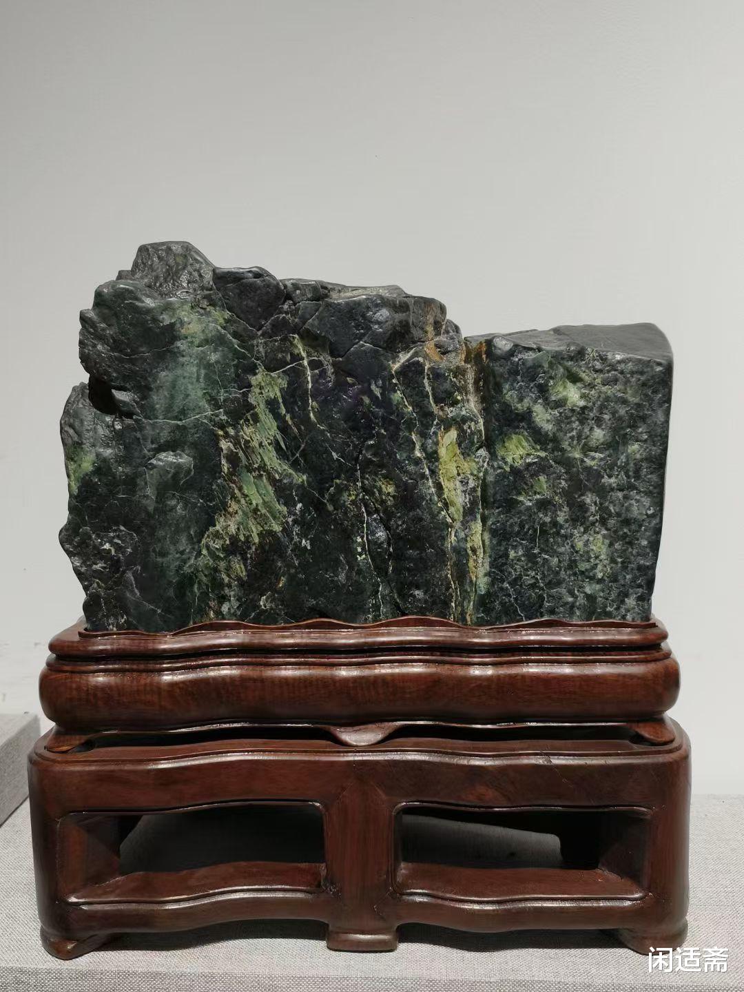 为更好地衬托山子案摆的雅致,还特别搭配了双层底座。底座选用与老绿石色泽相谐的木材打造,上层底座贴合石形,稳固承托山子;下层底座略宽,以简洁的线条勾勒轮廓,既增强了整体的稳定性,又通过层次感凸显出山子案摆的主体地位,避免了单一底座的单调感。底座表面打磨光滑,木质纹理自然可见,与老绿石的石质纹理形成 “木与石” 的材质碰撞,让整体陈设更显和谐雅致。