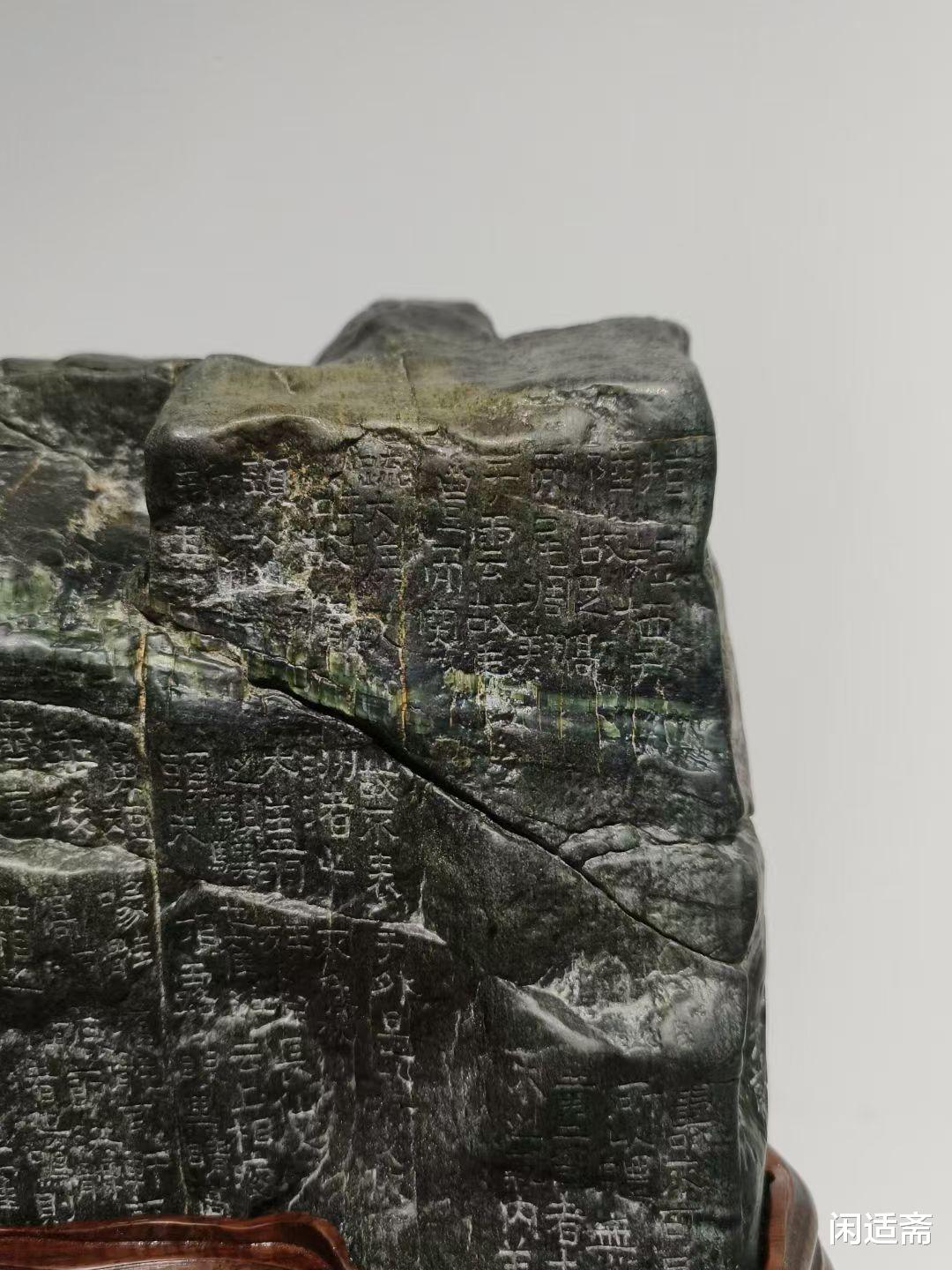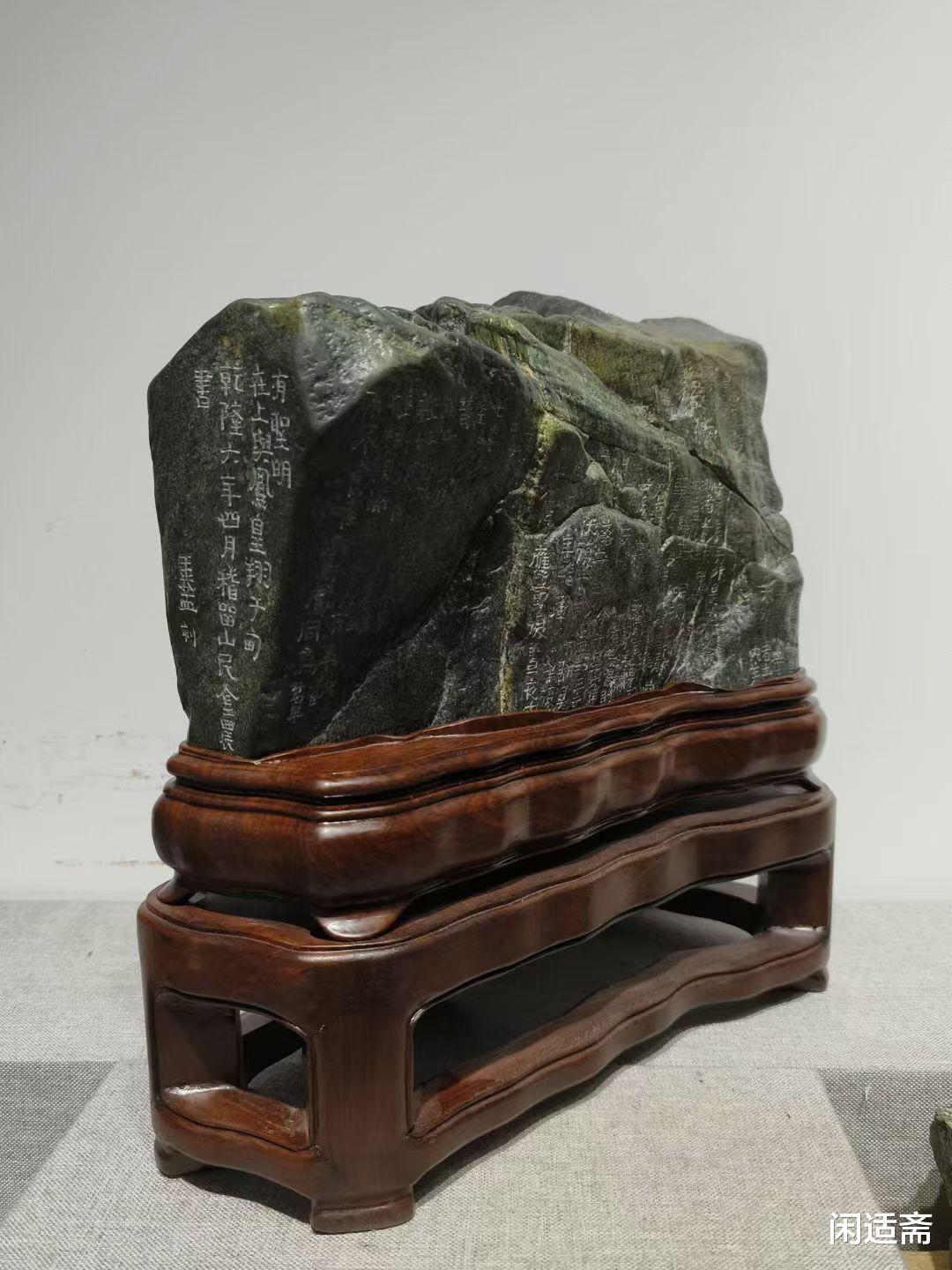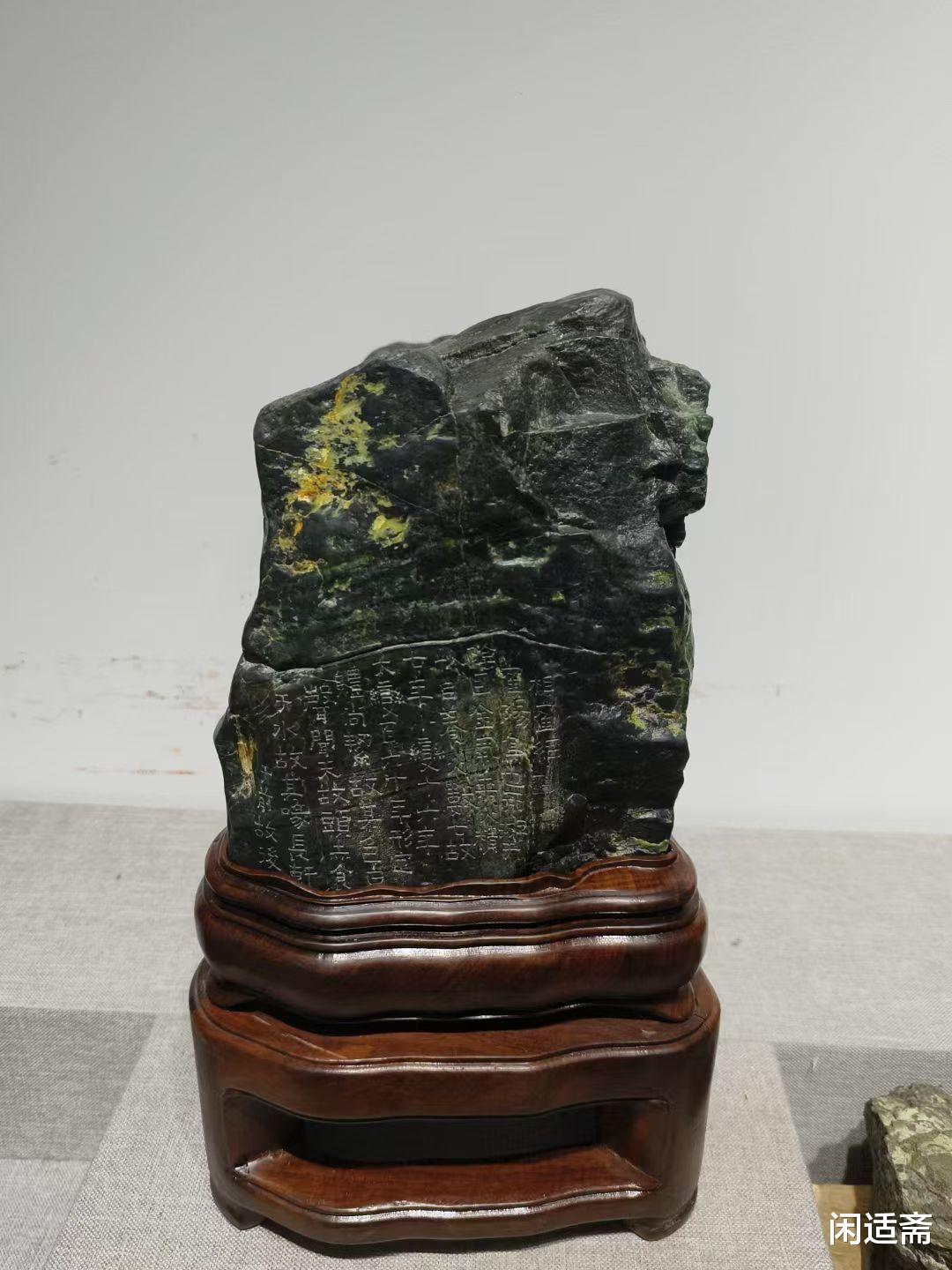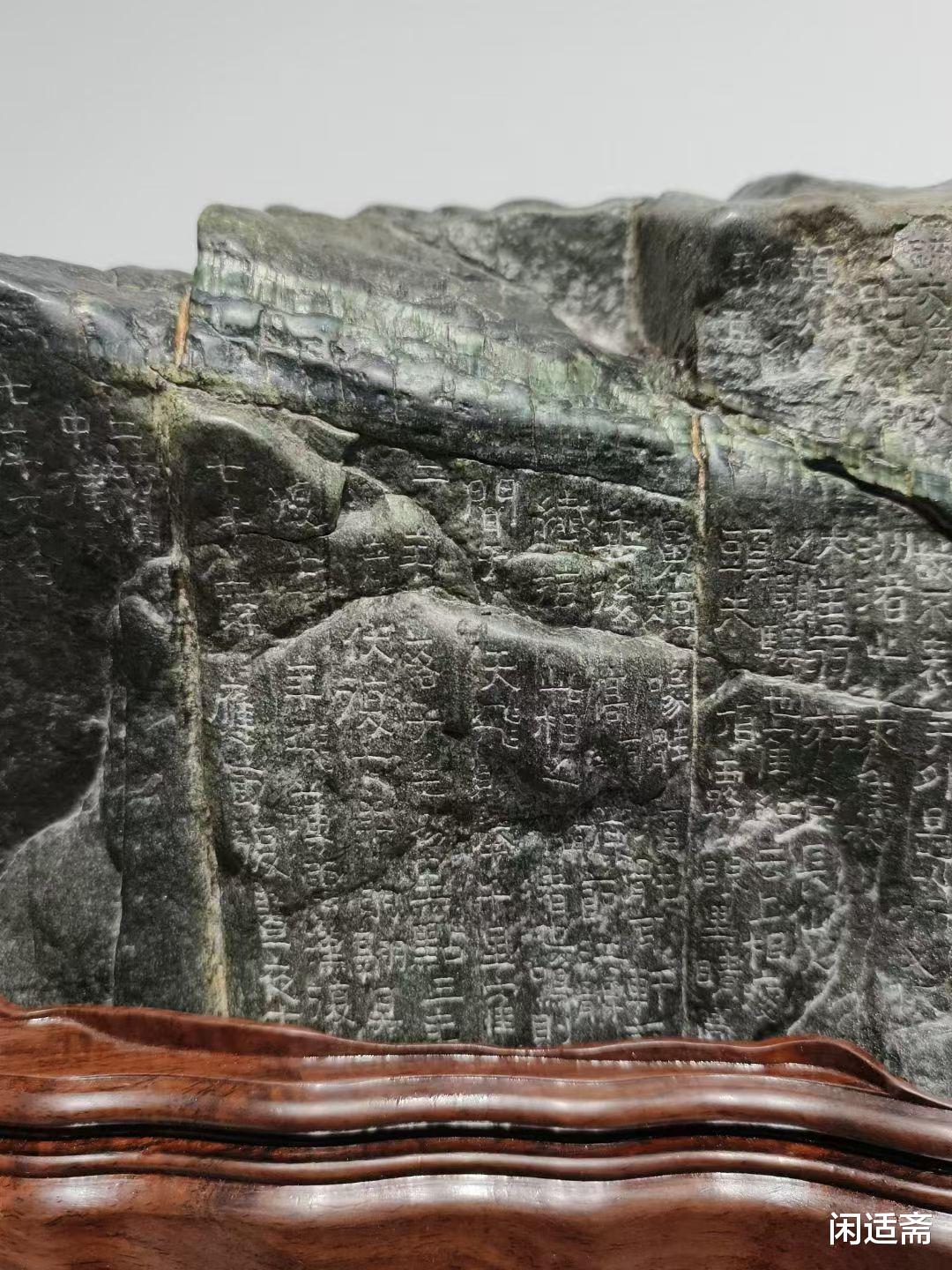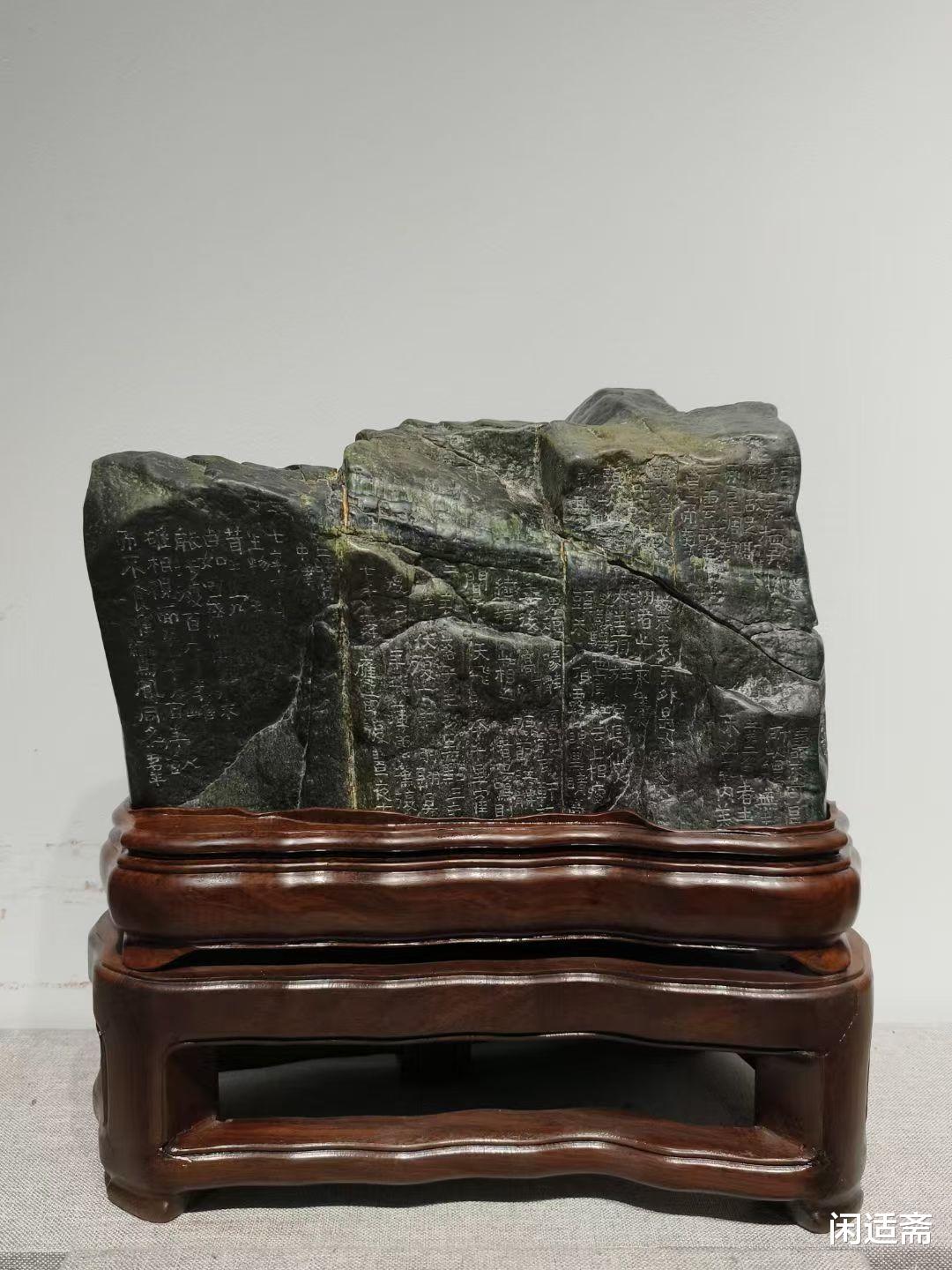 更添文化韵味的是,石上以手工镌刻金农鹤经—— 金农作为 “扬州八怪” 之一,书法风格独特,笔力苍劲古朴,自成一派 “漆书” 风骨,而《鹤经》题材本身便暗含 “高洁清雅、延年益寿” 的吉祥寓意。匠人以刀为笔,将金农书法的顿挫转折、古朴气韵完美复刻于石面,字体大小错落有致,笔画遒劲有力,与老绿石的温润质感相互映衬,让天然石韵与人文书法融为一体,既展现了匠人精湛的镌刻技艺,又为山子案摆注入了深厚的文化内涵,观之不仅能赏石之美,更能品书法之韵,感受传统文化的独特魅力。