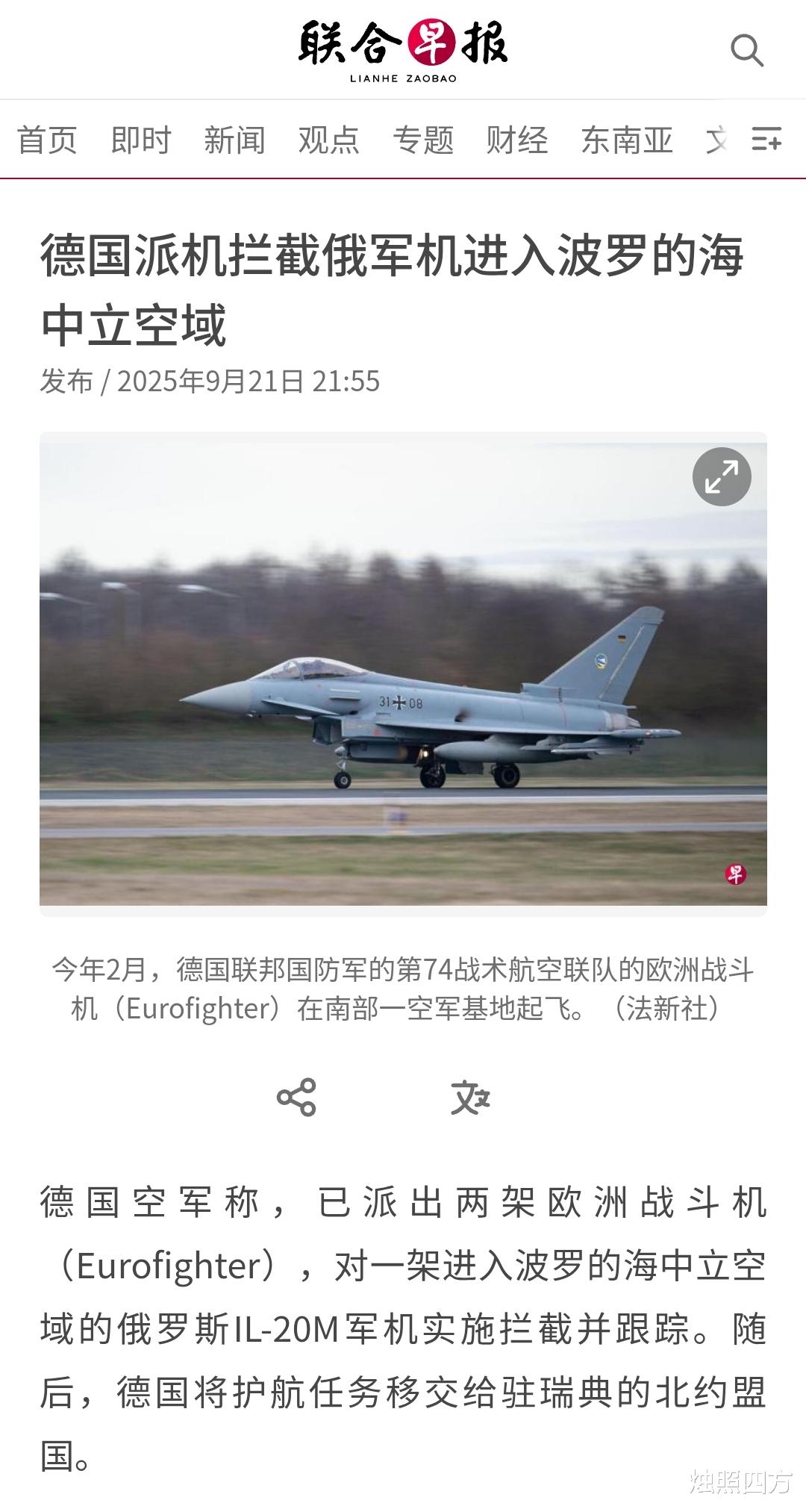 9月21日,新加坡《联合早报》发布多条国际新闻,显示俄欧矛盾进一步加剧。德国方面,派出两架欧洲战斗机,拦截一架进入波罗的海中立空域的俄国军机;英国方面,派出战机进入波兰凌空巡逻,回应此前俄国无人机侵入波兰领空;波兰方面,作为俄国威胁的首当其冲者,毅然关闭了波兰与白罗斯接壤的马拉舍维奇口岸。这轮矛盾的源头,是9月9日夜间,俄国20余架无人机侵入波兰领空。目前,涉事各方各说各话:俄国方面,拒绝对此事负责并声称被人栽赃;美国方面,试图给事态降温大事化小小事化了;欧洲的北约各国连同乌克兰方面,如临大敌严阵以待,指责俄国对东欧国家侵门踏户。