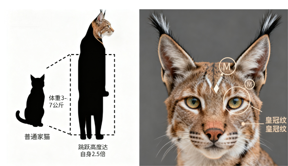 (二)头部与五官头部呈宽阔楔形,前额平滑饱满,脸颊肌肉发达,吻部短厚,鼻镜宽阔,颜色与毛色相匹配(虎斑色多为砖红色,单色多为粉色)。最具辨识度的是 “猞猁式耳朵”:中等大小,基部宽阔,耳尖圆润,部分个体耳尖带细小簇毛,耳间距为两眼间距的两倍,听觉灵敏度比普通家猫高出 20%。
