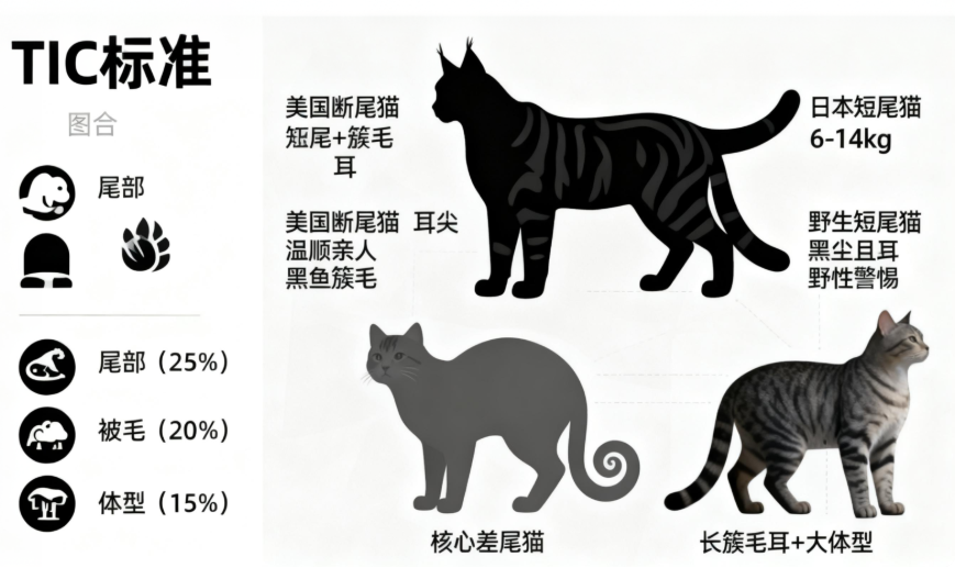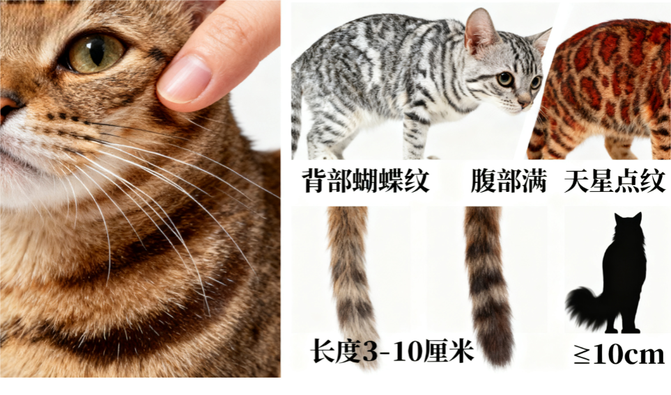 核心要求包括:体型中等至中大型,矩形结构;头部楔形,M 纹清晰;眼睛圆形至杏仁形,优先黄绿色;被毛短厚致密,斑纹清晰对称;尾巴 3-10 厘米,形态自然。猫展评分中,尾部特征占 25%,被毛质量占 20%,体型占 15%。