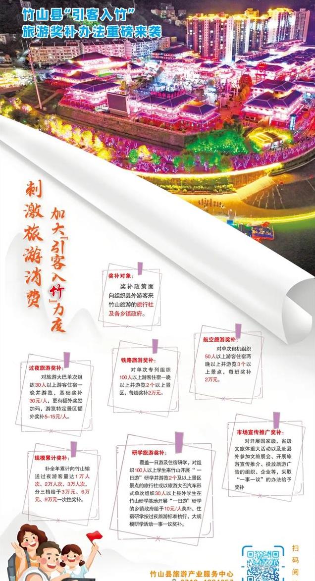 对全年累计向竹山县输送过夜游客达到1万人次、2万人次、3万人次的旅行社,分别给予一次性奖补3万元、6万元、9万元(不累计奖补)。