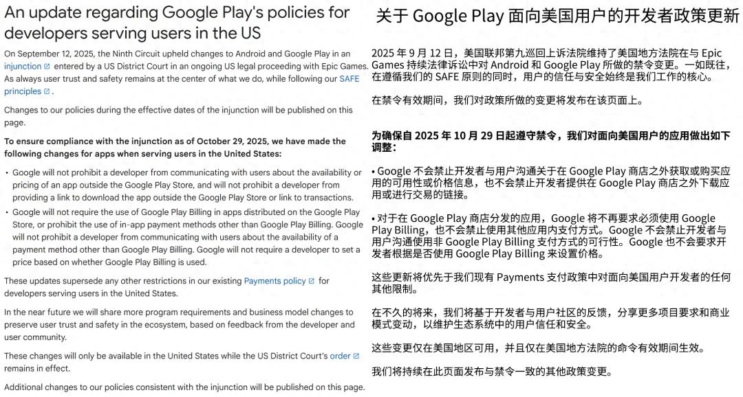美国时间10月29日,Google(谷歌)官网发布更新声明,表示他们将遵循法院颁布的禁令,在禁令有效期间,在美国地区内,不再要求Google Play商店的开发者必须使用Google Play Billing,也不禁止开发者们使用其他应用内支付方式。
