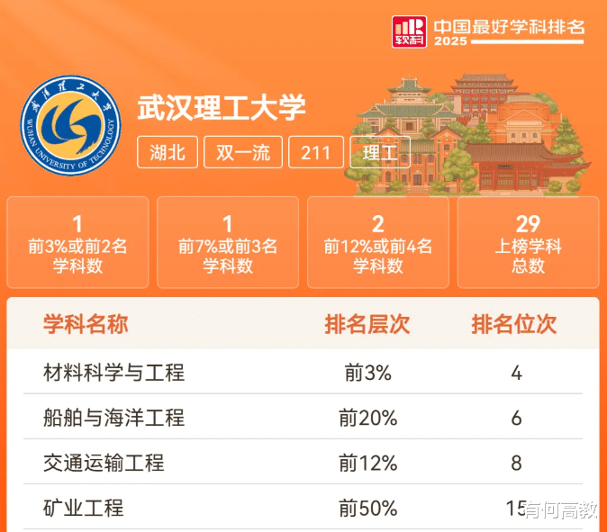 而近日发布的软科排名,更将武汉理工大学的学科实力展露无余:材料科学与工程位居全国第4,船舶与海洋工程学科位居全国第6,交通运输工程学科位居全国第8……