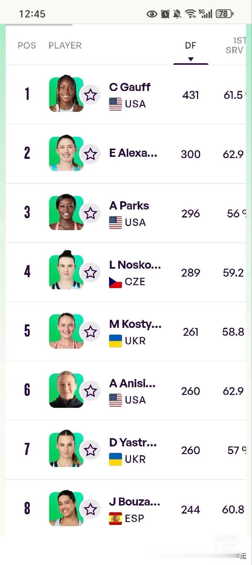 发球双误数量排行榜⬇️⬇️1、美国高芙,431