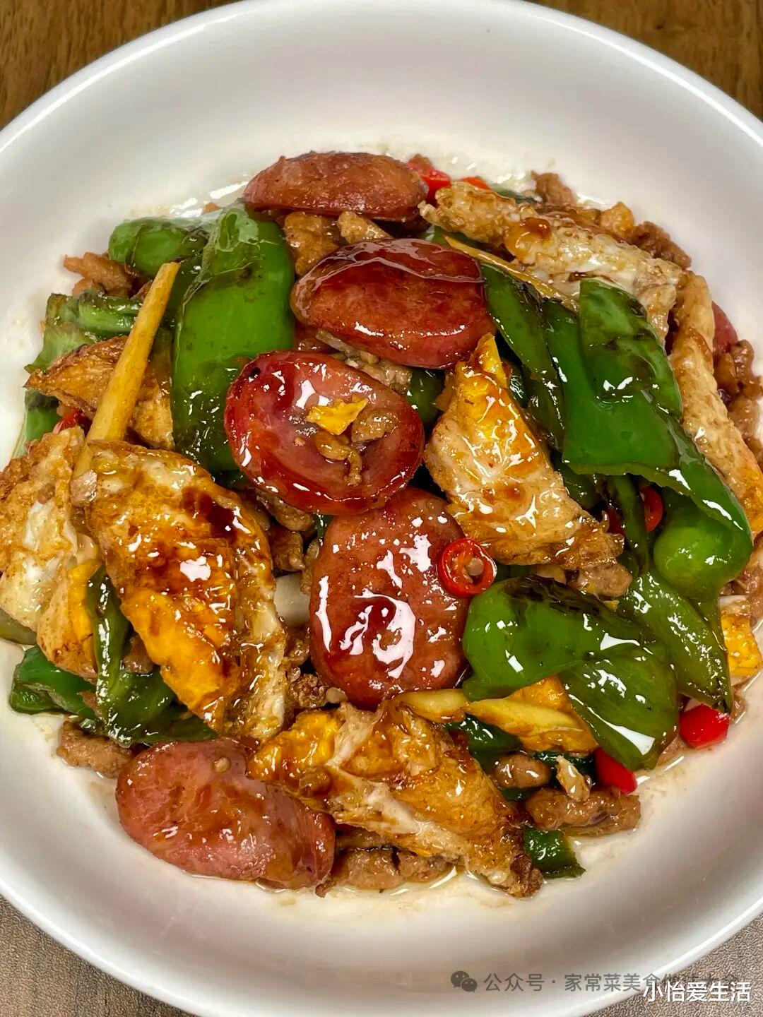 4. 放入青红椒段,大火翻炒。
