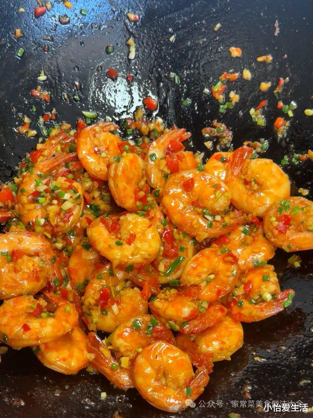 4. 转大火,将大虾倒入锅中,快速翻炒至虾身变红、弯曲。