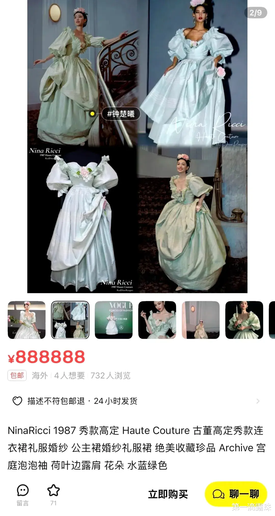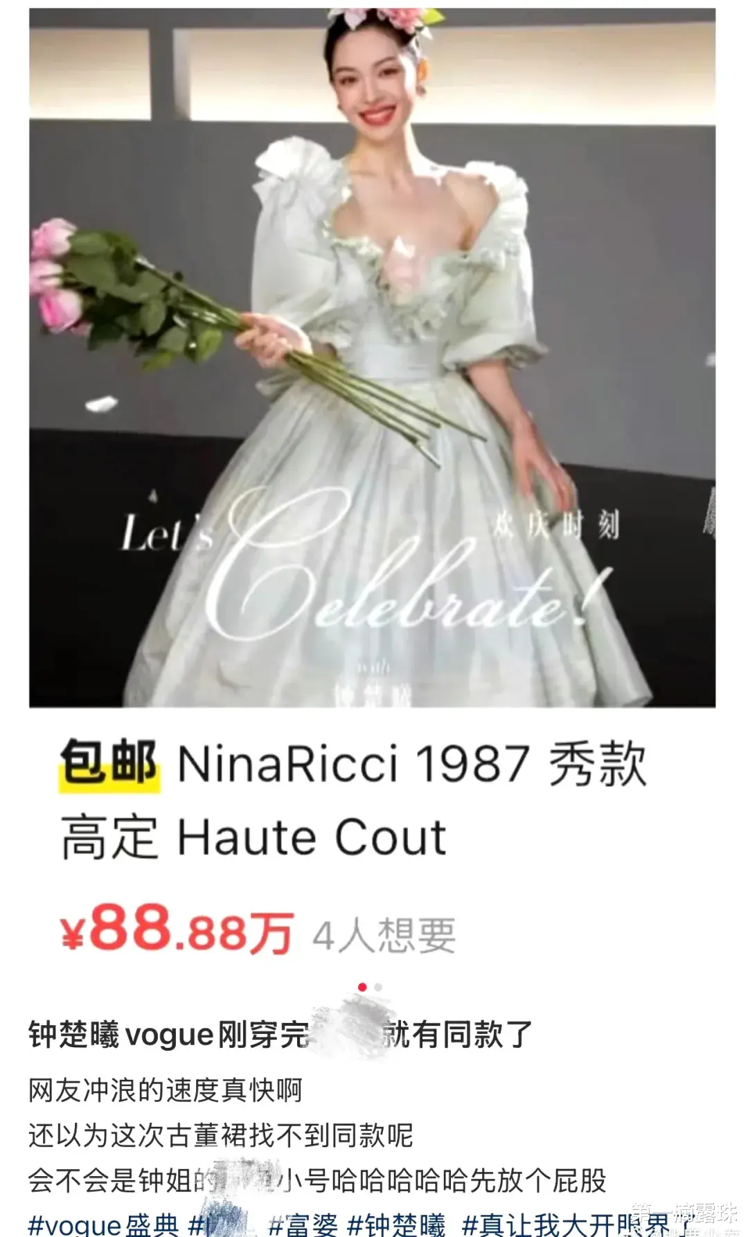 “一件穿了2小时的礼服,能卖88万?”最近VOGUE盛典的余温还没散,钟楚曦身上那件1987年的Nina Ricci古董高定就被挂上闲置平台,标价88.88万的消息,再次把她推上热搜。