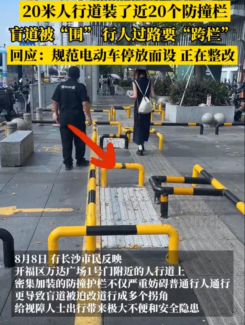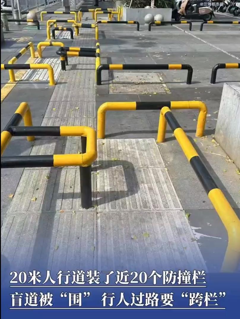 长沙人民最近解锁了“人行道跨栏”技能——开福区万达广场1号门外,短短20米人行道,竟被近20个防撞护栏占领。笔直盲道被迫扭成“九曲十八弯”,普通行人得反复抬腿跨越,活脱脱一场迷你障碍赛。而对依赖盲杖的视障人士?这简直是暗藏危机的“雷区”。