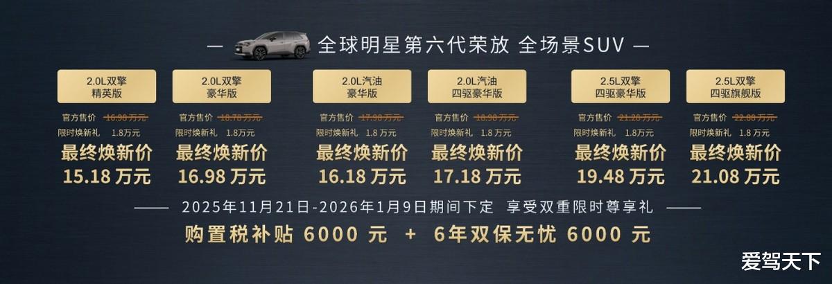 以上一代风尚PLUS2.0汽油版为例,售价为19.98万元;与之对应的全新荣放2.0L双擎豪华版,产品力大幅提升1.5万元,但定价却拉低1.2万元,较上一代产品综合价值提升接近2.7万元,官方售价为18.78万元。如在尊享预定期下定,叠加现金直给1.8万元的限时预定福利,最终焕新价低至16.98万元。在此基础上,还可享受6000元的购置税补贴以及价值6000元售后权益。