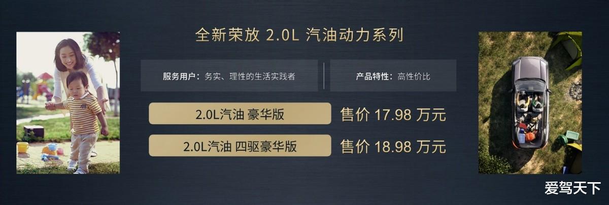 2.0L汽油动力系列面向的是务实、理性的生活实践者;他们信赖久经市场验证的成熟技术与丰田一贯的耐久品质。全新荣放提供了汽油动力的两驱和四驱两个版本;无论是专注城市通勤的豪华版,还是应对偶尔探险的四驱豪华版,全新荣放都将兑现对“高价值”的纯粹定义。全新荣放2.0L汽油豪华版,售价为17.98万元;全新荣放2.0L汽油四驱豪华版,售价为18.98万元。
