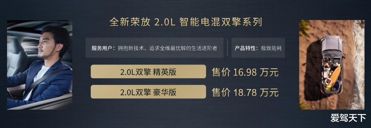 2.0L 智能电混双擎系列服务于拥抱新技术、追求全维最优解的生活进阶者,希望在性能与经济性、品质与科技感之间找到完美的平衡点;全新荣放2.0L双擎精英版与豪华版,让先进技术成为他们触手可及、全面提升生活品质的温暖伙伴。全新荣放2.0L双擎精英版,售价为16.98万元;全新荣放2.0L双擎豪华版,售价为18.78万元。