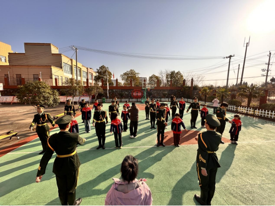 仪式落幕,温情互动的大幕随即拉开。在师生的见证与鼓励下,国旗班队员主动走近孩子们,化身耐心细致的“小老师”。他们纷纷蹲下身,与孩子们平视相对,手把手地教孩子们练习“抬头、挺胸、齐步走”等队列动作。考虑到孩子们的接受能力,队员们特意放慢节奏,用夸张的口型辅助理解、用轻柔的手势传递指令,配合耐心细致的讲解,一遍又一遍示范、纠正动作。从最初的懵懂生疏,到渐渐跟上节奏,当孩子们终于能勉强走出整齐的小步子时,队员们立刻用提前学好的手语比出“你真棒”。收到赞许的瞬间,孩子们的脸上瞬间绽放出灿烂又纯粹的笑容,眼眸里盛满了喜悦的光芒。