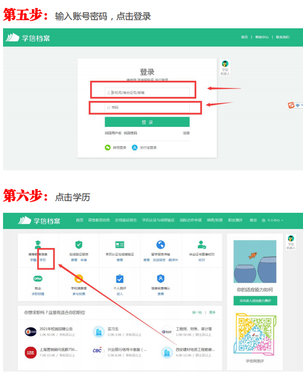 2.学信网账号的可以直接登录,没有账号的点击“注册学信网账号”根据步骤注册后登录。用户名是手机号或身份证号码