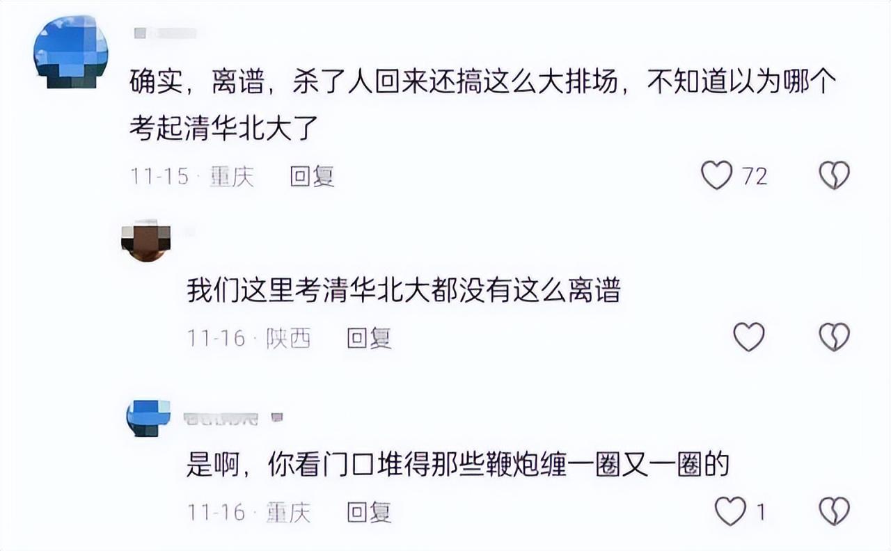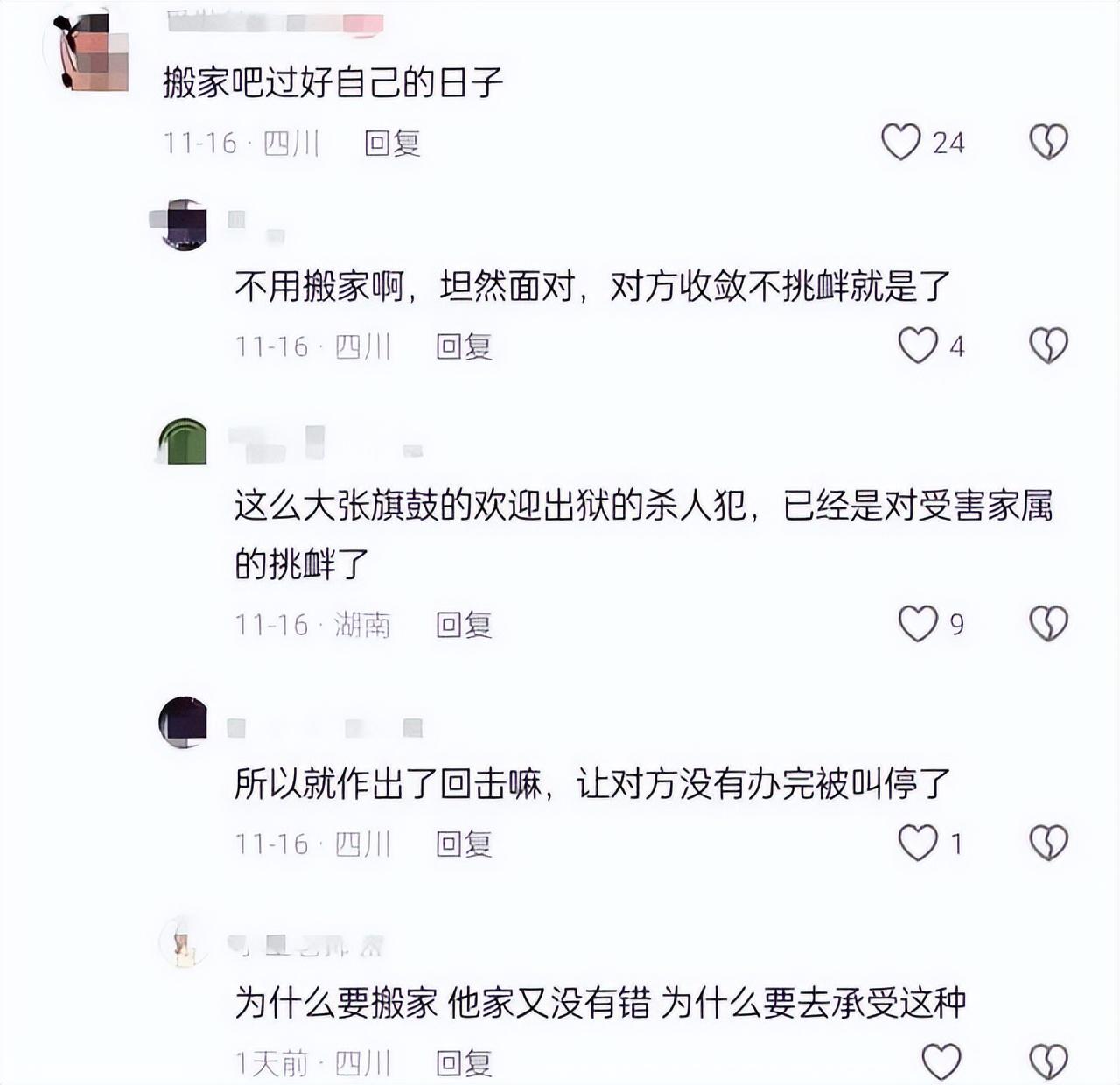 但更多网友则认为,无论凶手出于何种原因庆祝出狱,都不应该在受害人家门口进行这样的举动,这不仅是对受害人和家属的不尊重,也是对社会公序良俗的严重挑战。