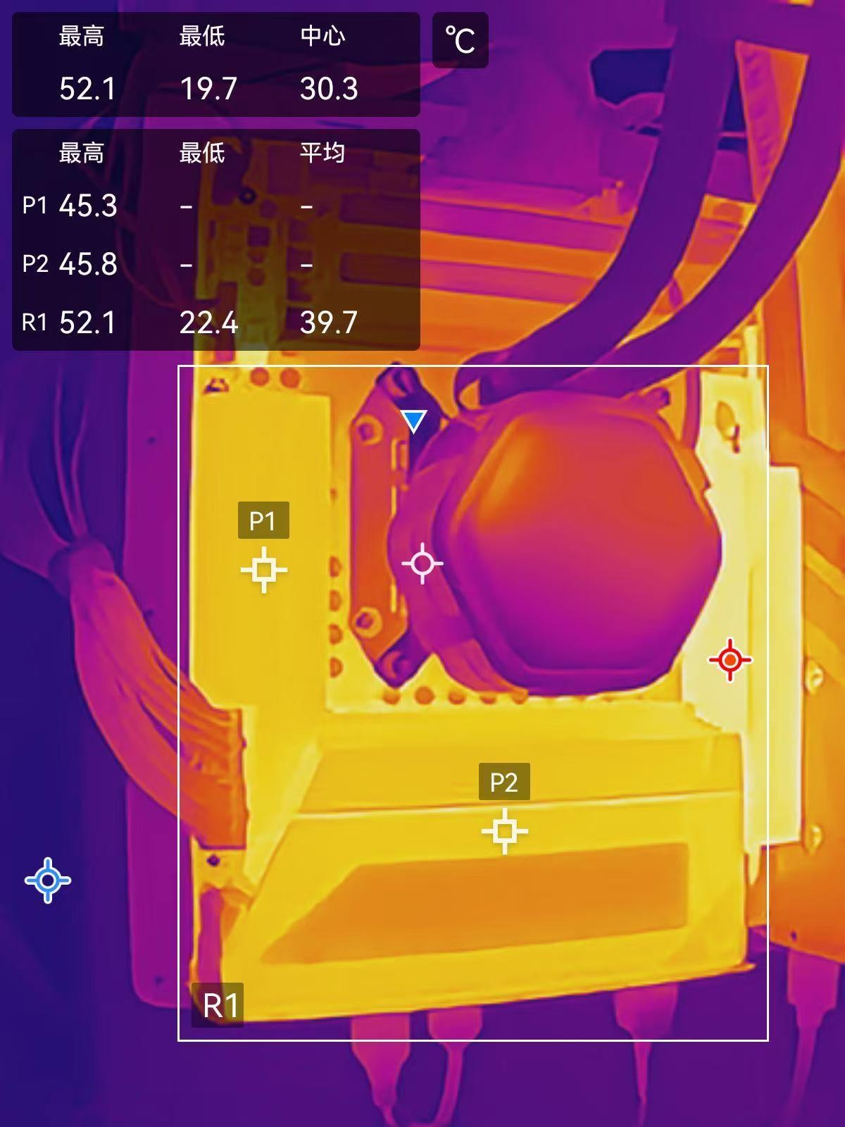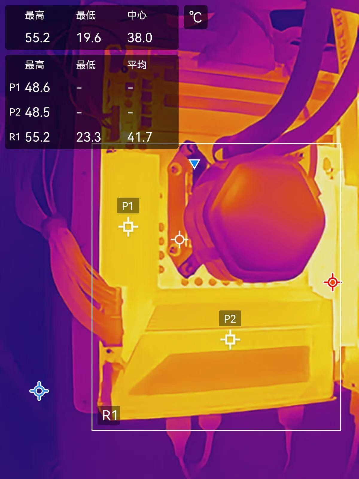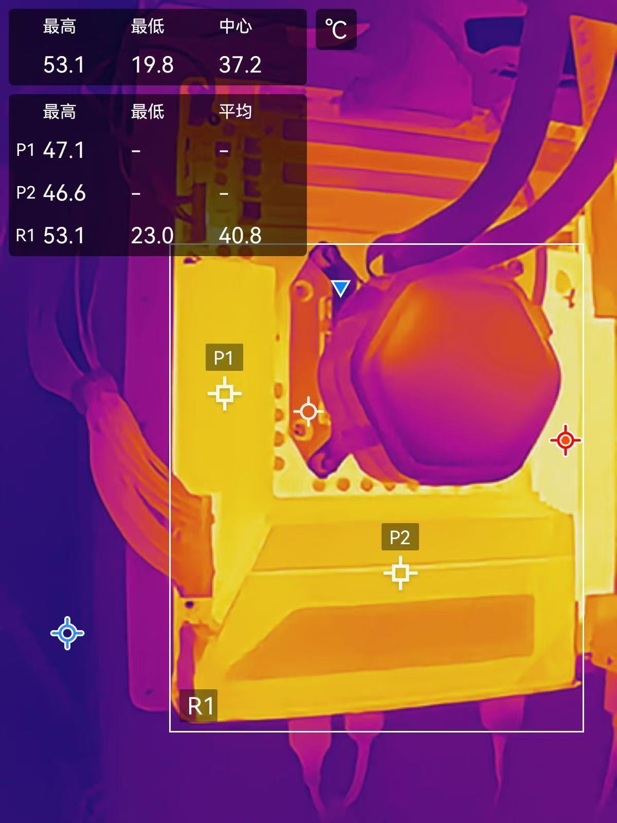 下面两张图分别是默认状态和105W状态下的主板各部分的温度对比。P1、P2分别为主板供电部分两个散热片的温度。R1为整个主机最高温度的区域,出人意料的是,温度最高的区域,竟然是PCIe 5.0×4的固态硬盘。值得一提的是,技嘉这款X870E X3D电竞冰雕,给PCIe 5.0×4固态硬盘提供了大体积的散热马甲,现在看来,这是有必要的。